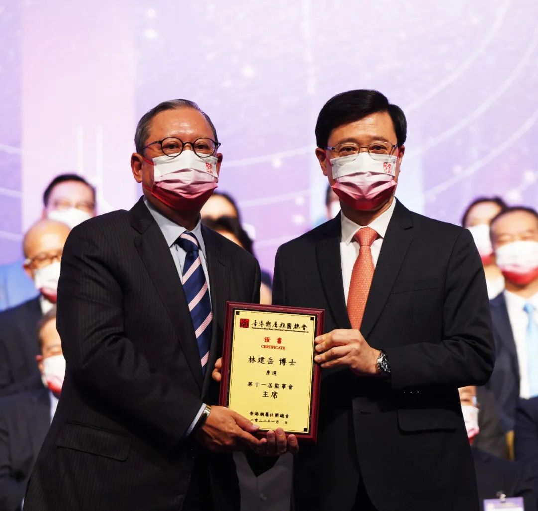 行政長官李家超(右)向林建岳頒發監事會主席證書