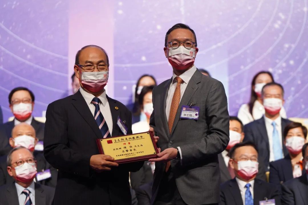 律政司司長林定國(右)向陳強頒發名譽會長聘書