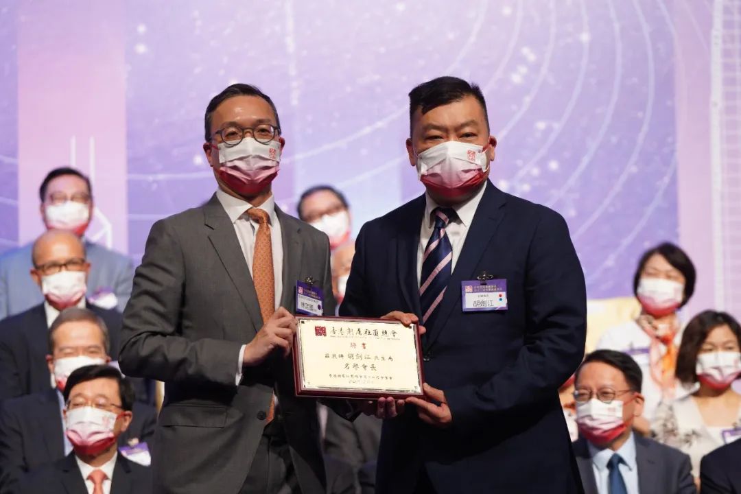 律政司司長林定國(左)向胡劍江頒發名譽會長聘書