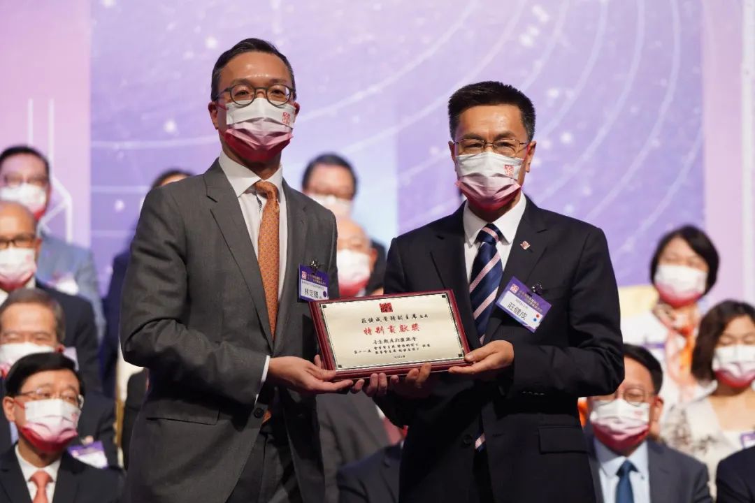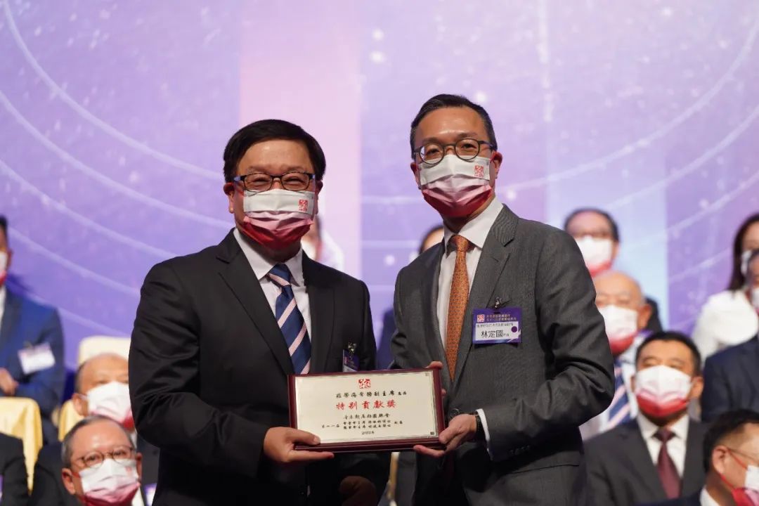 律政司司長林定國(左)向莊健成頒發特別貢獻獎