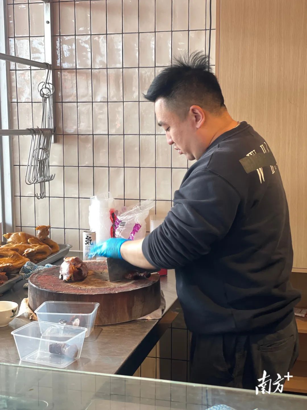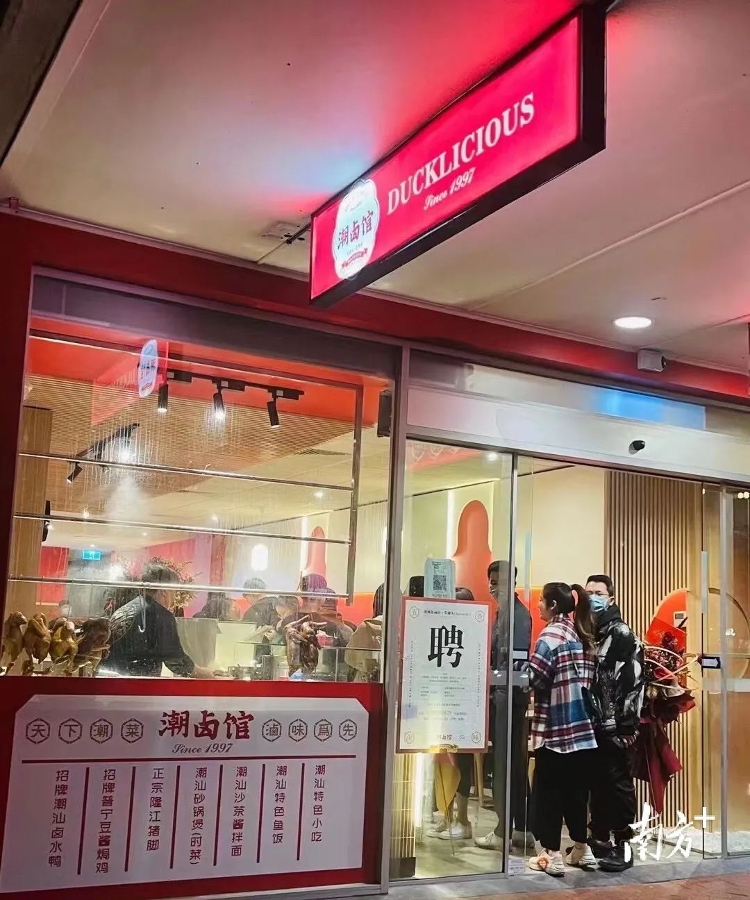 謝佳曉告訴南方記者,滷汁是滷味的靈魂,滷汁的好壞將直接影響整個滷味的口感。潮汕滷汁選用幾十種藥材、香料熬製數小時濃縮而成,雖然大部分中藥材國外都有,但品質還是國內的更好。原食材方面,因為墨爾本的鵝肉品質不及家鄉的獅頭鵝,他們選擇用鴨子代替,「我們只能盡力去還原最接近潮汕滷味的味道。」不同的食材,滷製時長也不同,全靠滷製人的經驗和把握,特別考驗功夫。為了將潮汕滷味製作技藝傳承下來,曾慶淞和謝佳曉夫妻倆手把手向媽媽學習。40多平方米的廚房裏,一口大鍋,夫妻倆時常被熱氣熏得滿臉通紅、汗流浹背。功夫不負有心人,滷味外賣剛開始便大火,最火的時候一天售賣150—200隻滷鴨左右。「我們的鏈接一發直接秒空,不少人都得提前幾天預訂,這確實是意料之外,而且大部分人吃完的回饋也很好,所以讓我們有了信心。」謝佳曉告訴記者,因為外賣大火,原有的廚房空間也遠遠不夠使用,「看大家都很喜歡潮汕菜,我們也是很開心的,也想多增加一些潮汕特色的菜品,於是我們籌劃開實體店。」2021年7月,佔地200平方米的「潮滷館」正式在莫納什大學附近開業,滷鴨作為招牌,吊掛或鋪擺在檔口吸引著路過的食客,此外招牌菜還包括普寧豆醬焗鴨、隆江豬腳、沙茶醬拌麵、特色魚飯、蠔烙、腸粉等,許多對潮汕菜感興趣的食客,在品嚐後紛紛在社交平臺上留下了好評。「這家潮汕菜館真的讓我想家想我媽了,都快三年沒回家了,在外吃到家的味道真的想哭。」記者在社交平臺上,搜索到不少因疫情無法回國的潮汕人對「潮鹵館」的評價,謝佳曉說,許多走心的評價讓他們備受鼓舞。