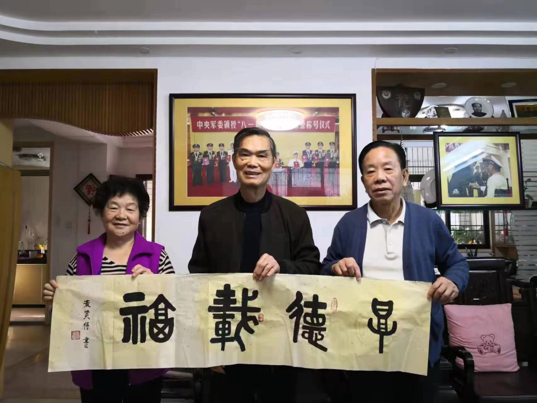 二十多年來,在我與麥賢得、李玉枝夫婦的真摯友情交往中,已結下不解之緣,多少次,多少回,在其家中,我最喜歡看著他居住的海軍家庭宿舍中,那二十多平方大廳的牆壁上掛著的活動相片和麥英雄閒暇時書寫的篆書字體,「愛黨愛國愛人民」在深深感慨之際,又能翻閱到他倆每次參加的公益慈善和深入部隊營房,學校,鄉村的留影和蹤跡。
