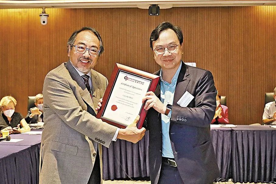 新任院長盧煜明(右)向卸任的創院院長徐立之(左)贈送感謝狀