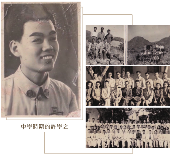 許學之的中學階段就讀於汕頭市第四中學(原汕頭市大中中學),學校前身是潮州八邑職業學校,是在上海潮州會館支援下於1917年開辦、發展的歷史悠久的中學,亦是旅滬潮人在自己家鄉創辦的第一所學校。因歷史原因,1939年至1945年社會動盪期間,許學之在困苦中就讀遷於鄉村的大中中學,直到學校遷回汕頭市重辦後得以返校升讀高中學業,並順利完成高中課程。許學之明白機會來之不易,於是更加珍惜光陰。當時年輕的許學之待人友善,與同學們結下濃厚的同窗情,全體同學都稱呼他為「我們的班長」,而他也都非常尊敬和聽從老師的教導,視老師如父母,在整個高中生涯中得到老師和同學們的認可與支持,成為學校的模範生。