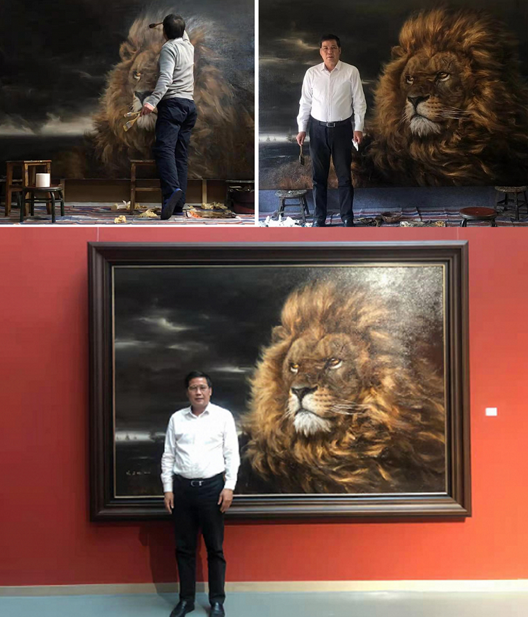 “獅子的鬢毛在海風中迎風豎立,展現了它英勇無畏;獅子的眼神是整張畫的靈魂所在,是我著力要表達的地方,透過眼神人們能看到它的堅定冷靜和高度警惕;獅子臉上和身上的傷疤則象徵著中華民族五千年來歷盡的苦難和累累的傷疤……”整幅畫作很好地詮釋了當今的中華民族堅韌勇毅的精神,也詮釋了中國人們從站起來、富起來到強起來的偉大歷程。