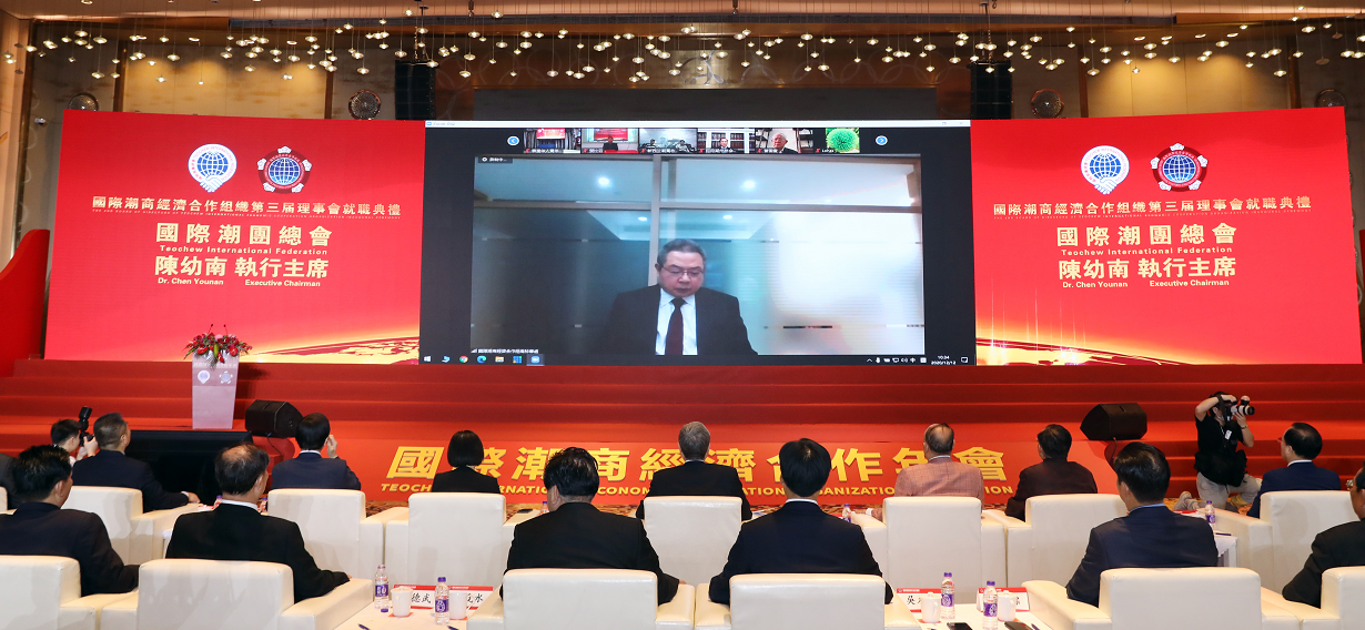 國際潮團總會執行主席陳幼南博士通過視頻宣讀新一屆理事會領導任職決議