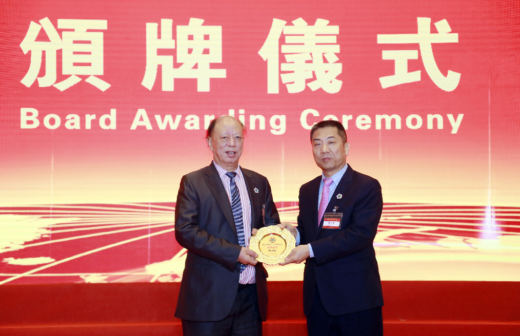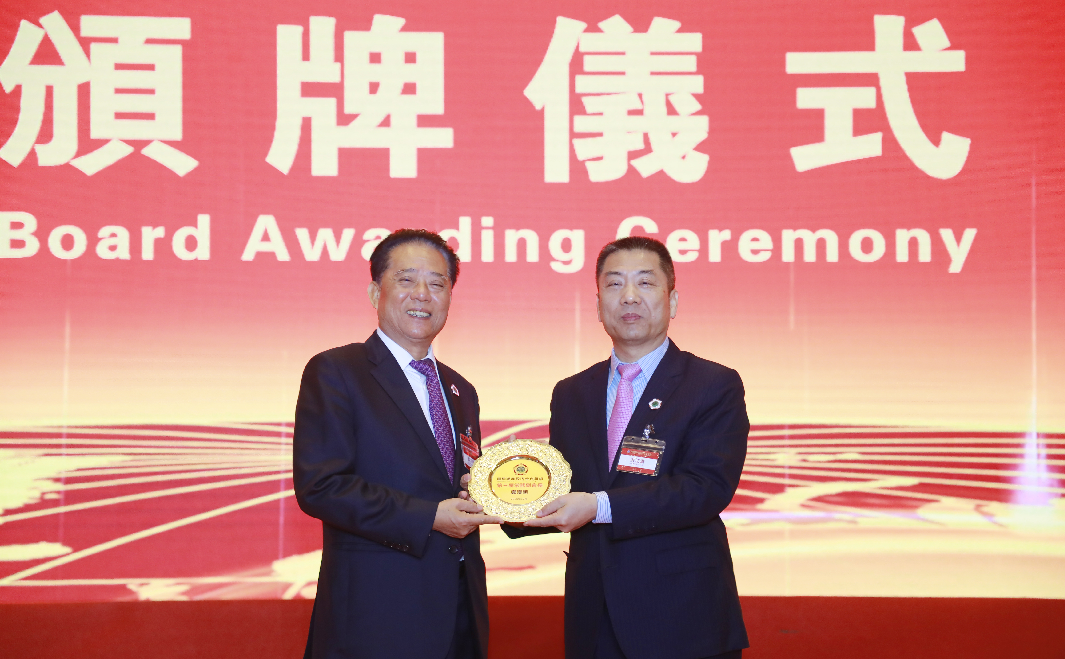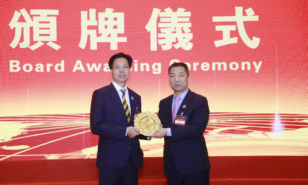 國際潮團總會主席洪江遊(右)為國際潮商經濟合作組織名譽主席林少毅(左)頒牌
