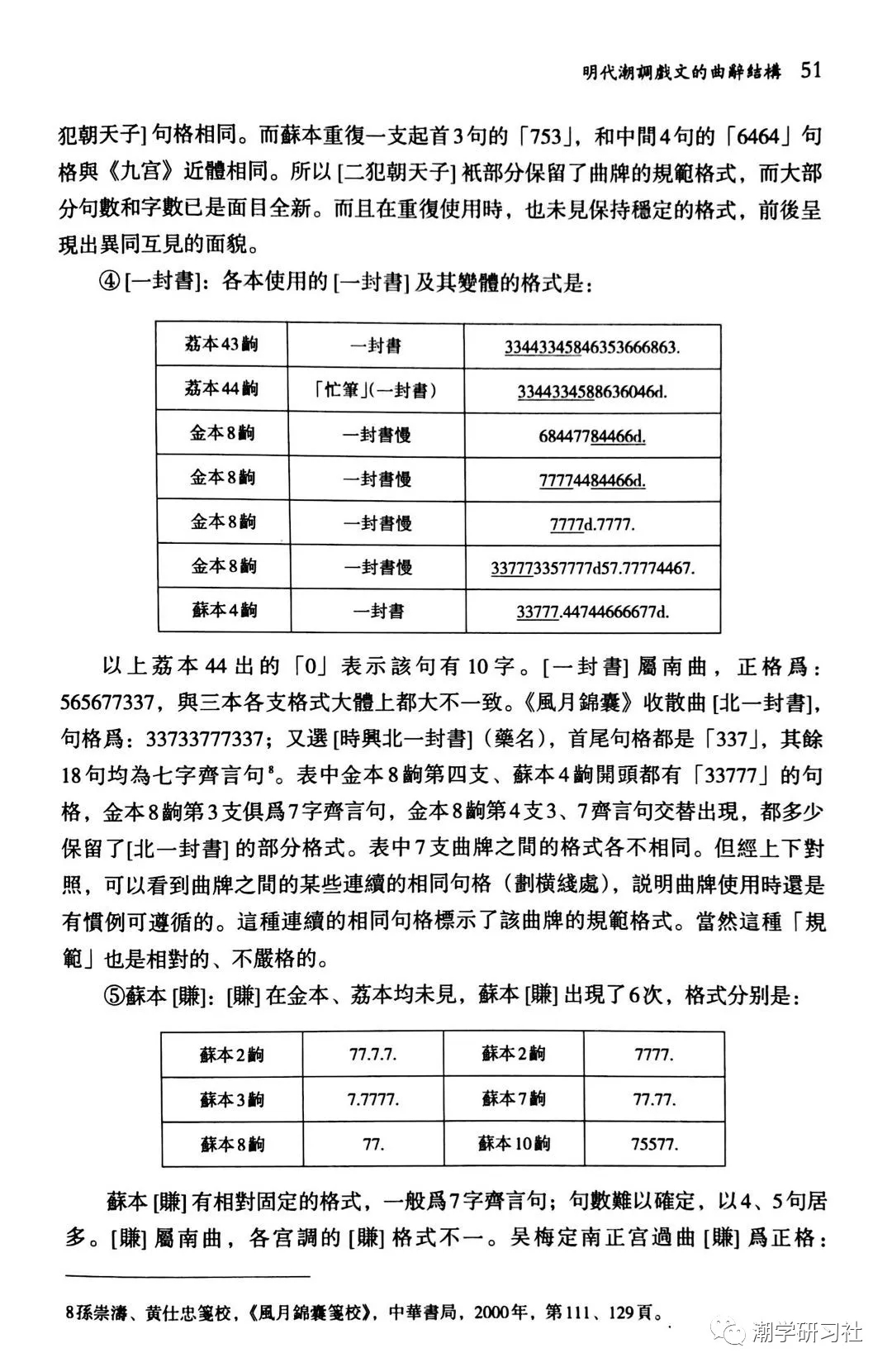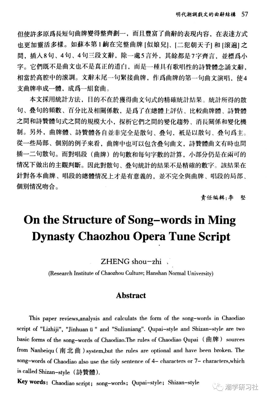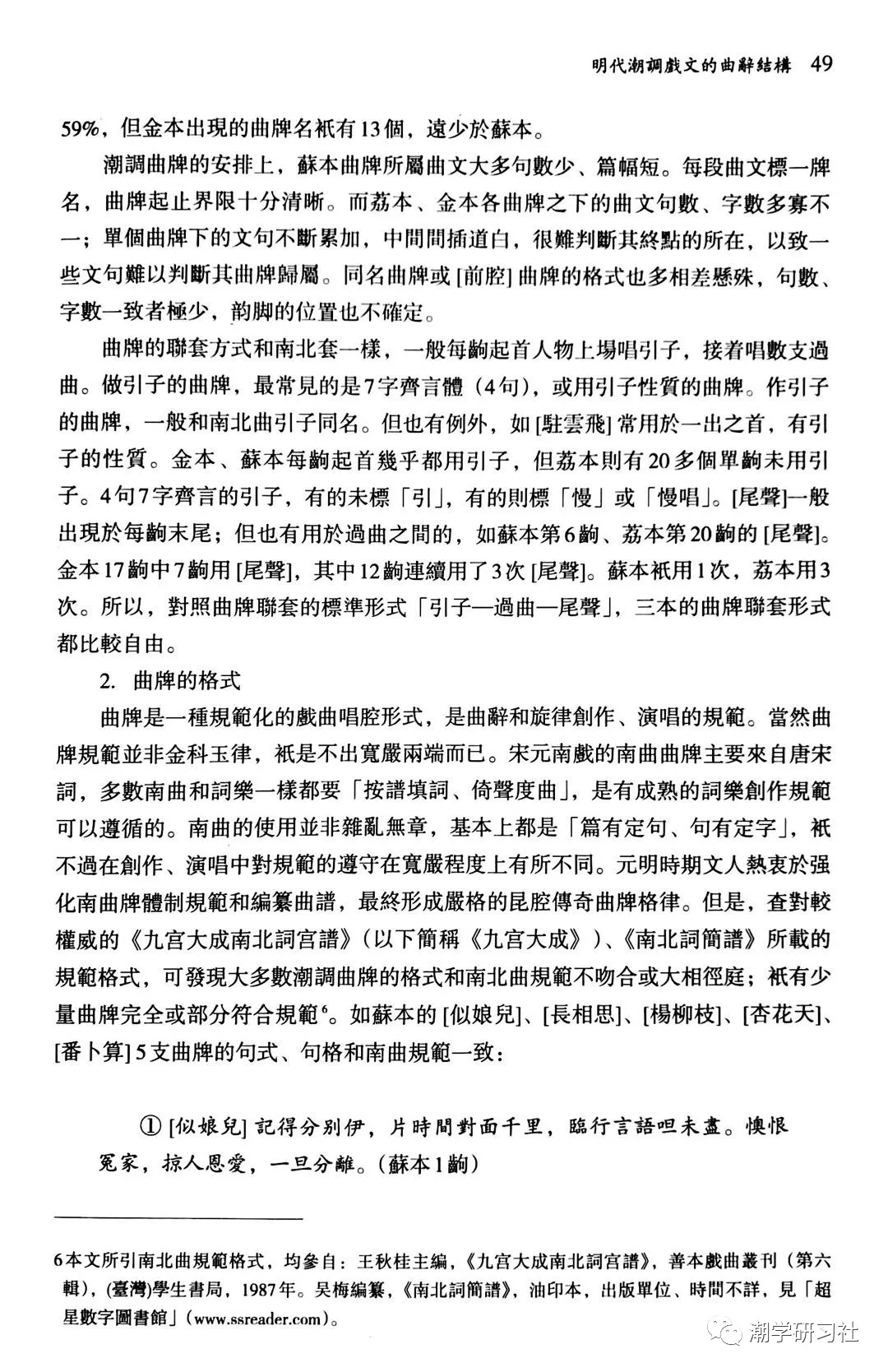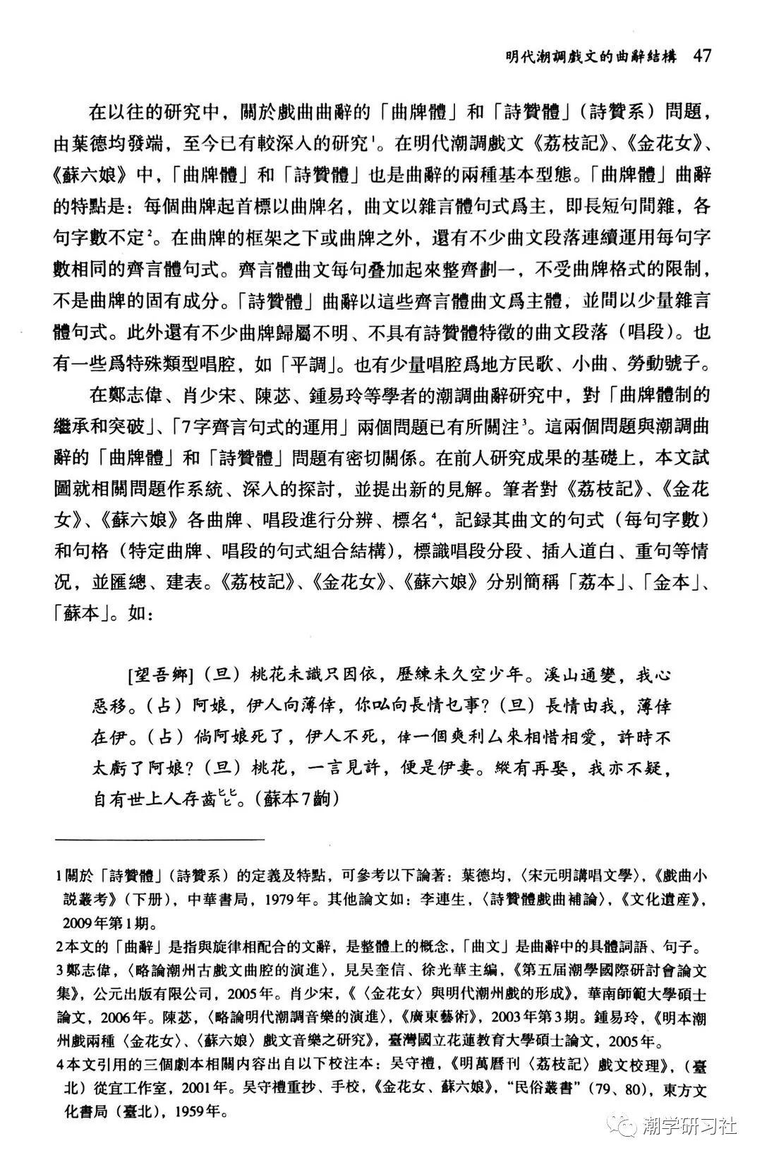 本文對明代潮調劇本《荔枝記》、《金花女》、《蘇六娘》的曲辭格式進行了考察、統計和分析。潮調曲辭包含「曲牌體」和「詩讚體」兩種基本型態。潮曲牌體制源自南北曲體制,但對南北曲規範的援引又是極自由的,潮調曲牌規範已普遍解體。潮調運用四字、七字齊言詩讚體,產生了新的曲辭規則。
