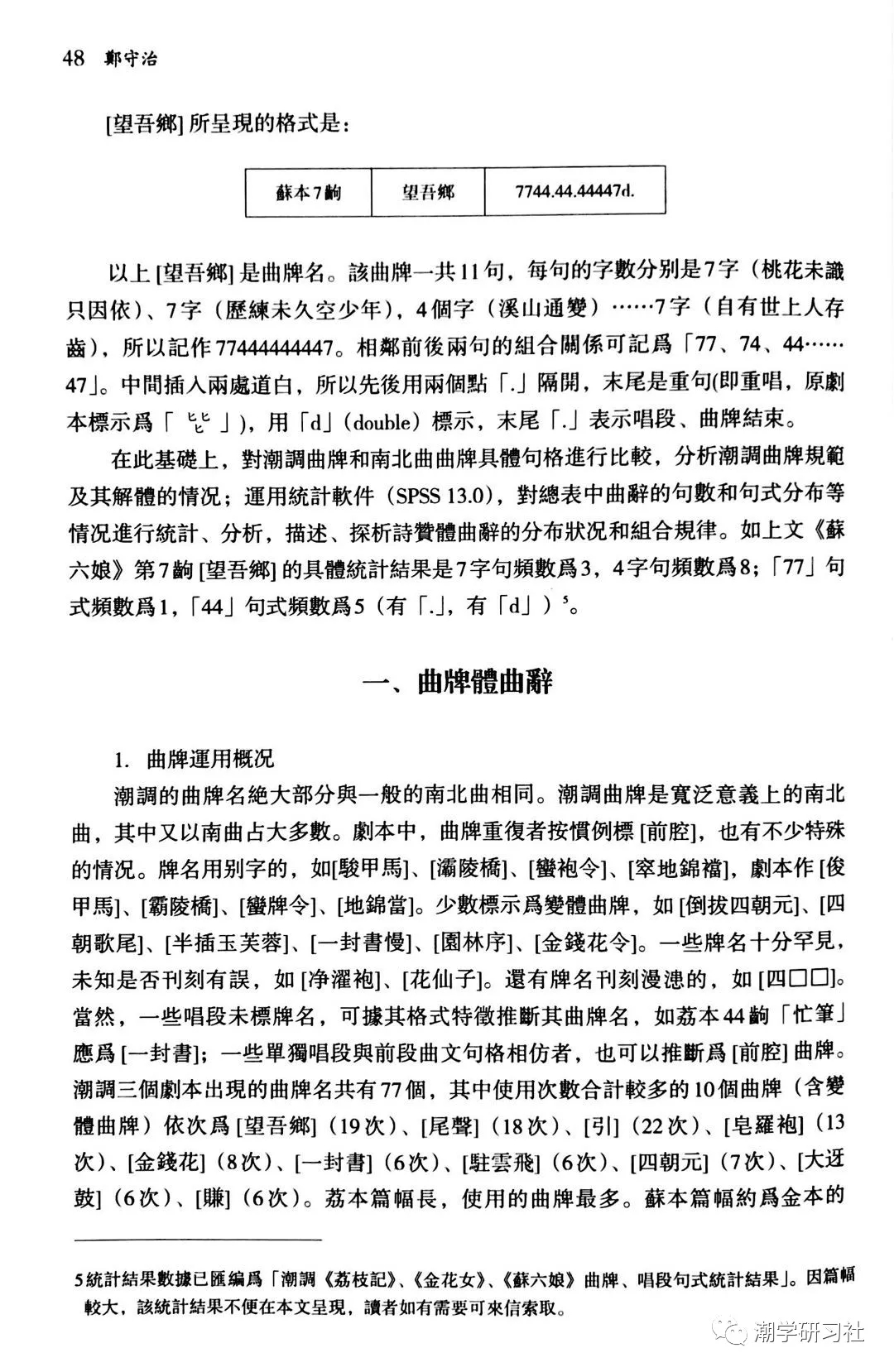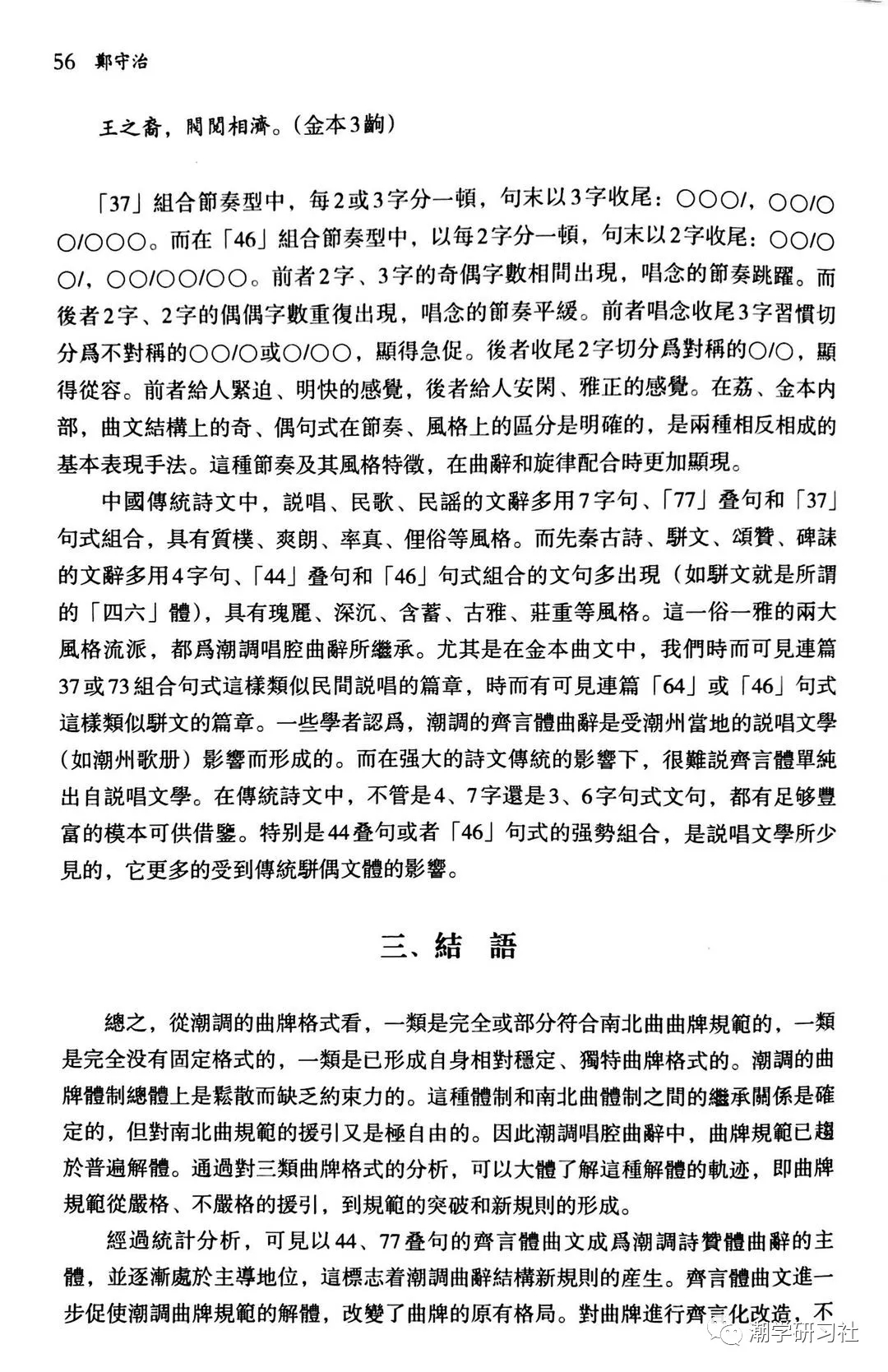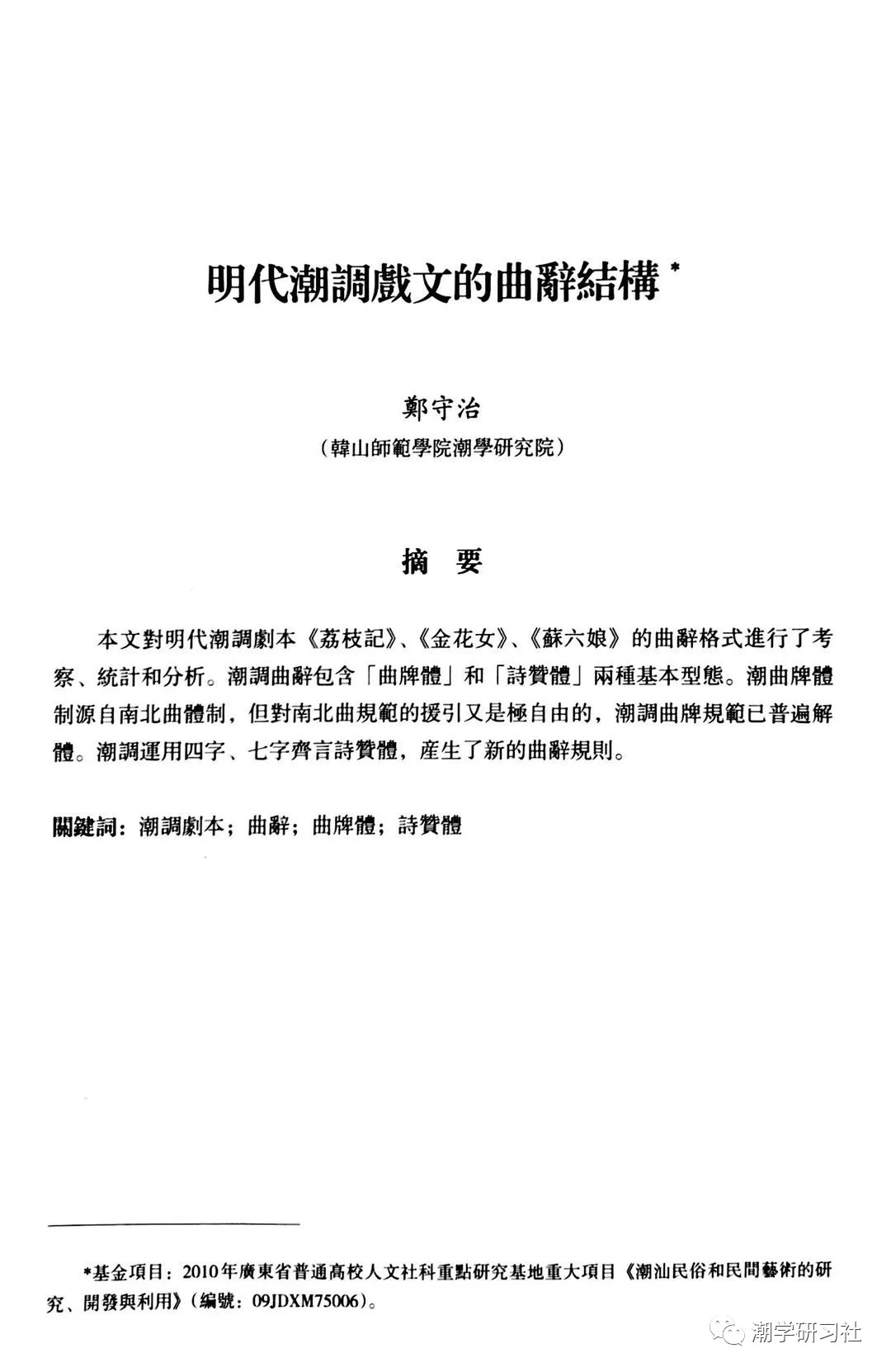本文對明代潮調劇本《荔枝記》、《金花女》、《蘇六娘》的曲辭格式進行了考察、統計和分析。潮調曲辭包含「曲牌體」和「詩讚體」兩種基本型態。潮曲牌體制源自南北曲體制,但對南北曲規範的援引又是極自由的,潮調曲牌規範已普遍解體。潮調運用四字、七字齊言詩讚體,產生了新的曲辭規則。