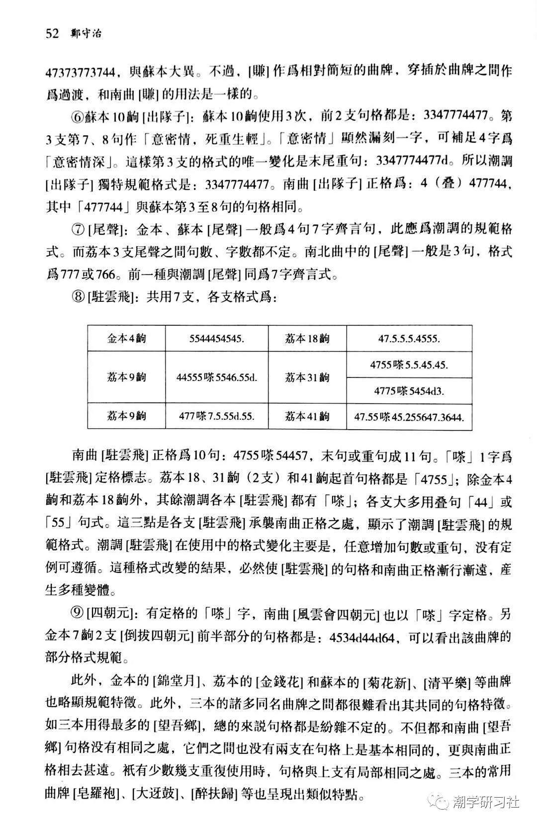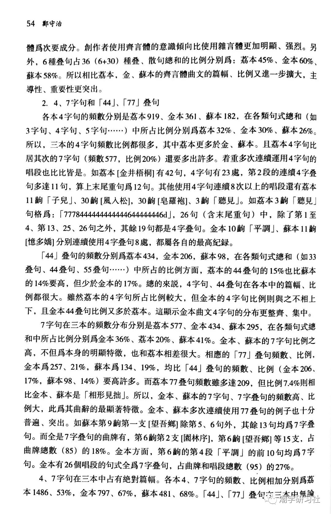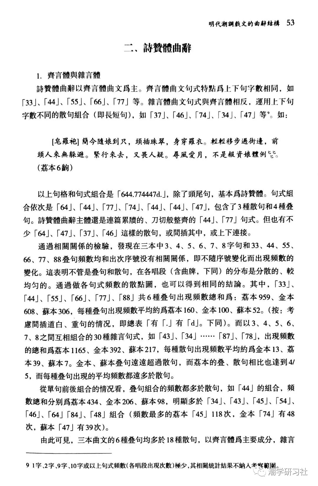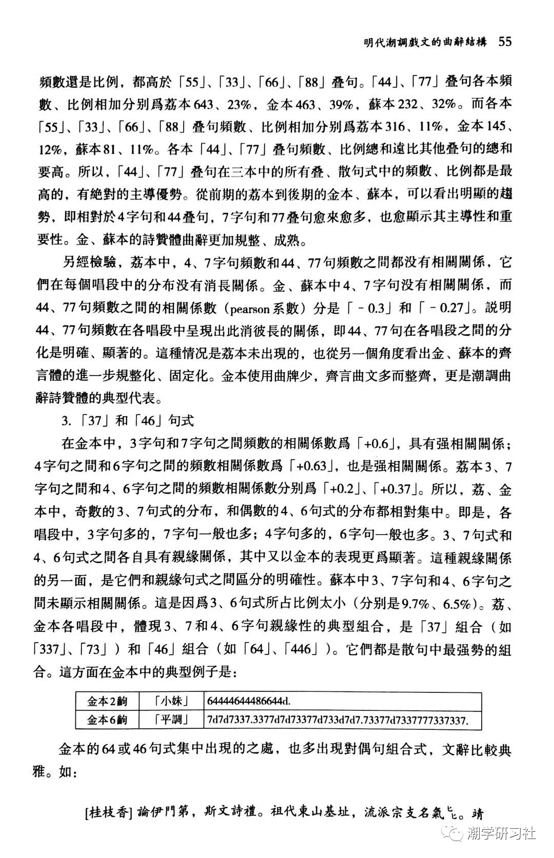 本文對明代潮調劇本《荔枝記》、《金花女》、《蘇六娘》的曲辭格式進行了考察、統計和分析。潮調曲辭包含「曲牌體」和「詩讚體」兩種基本型態。潮曲牌體制源自南北曲體制,但對南北曲規範的援引又是極自由的,潮調曲牌規範已普遍解體。潮調運用四字、七字齊言詩讚體,產生了新的曲辭規則。