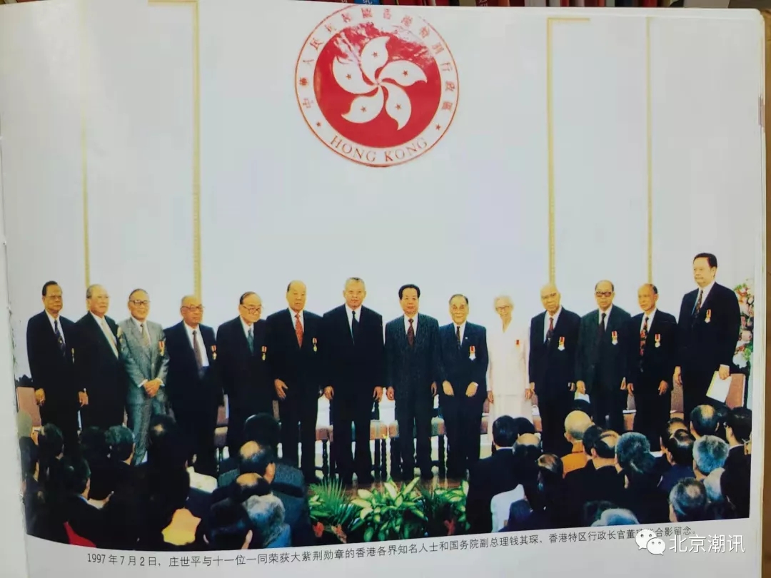 1997年7月2日,莊世平先生(右6)與十一位一同獲得大紫荊勛章的香港各界知名人士和國務院副總理錢其琛、香港特區行政長官董建華合影留念