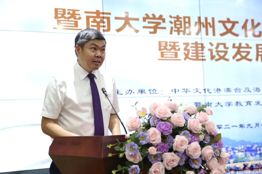 宋獻中校長在致辭中指出,暨南大學素有“華僑最高學府”之稱,學校堅持“僑校+名校”發展戰略,以“中華文化播八方”為己任,不斷構建中華優秀傳統文化傳播發展工作新格局;潮州文化不僅是一種地域文化,其人文現象更與整個國家的文化歷史分不開。習近平總書記視察潮州重要講話為深化潮州文化研究提供了重要指引。將中華文化傳播到五洲四海是暨南人與海內外潮州人的共同使命,潮州文化研究院在暨南大學的成立正是落實習近平總書記視察暨南大學和潮州講話精神的重要舉措。