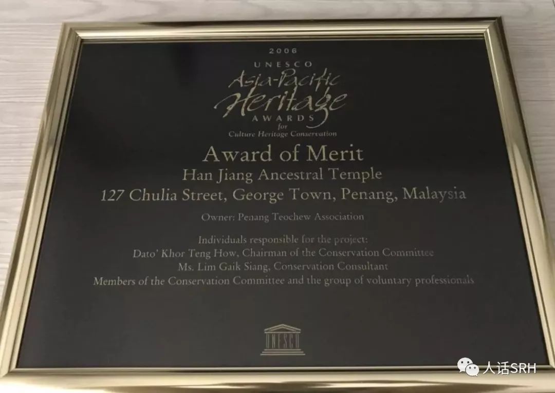 聯合國教科文組織「2006年亞太區文化遺產保護獎」評審團評語:「這一座建於19世紀中期的韓江家廟是凝聚了檳城潮人社會的群體力量,而恢復了它原本的光彩和風貌,這種精神是我們所讚賞的。」