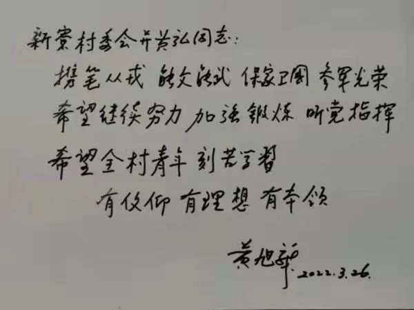 在信中,黃旭華給自己的小老鄉點讚「攜筆從戎、能文能武、保家衛國、參軍光榮」。他還勉勵家鄉有志青年「刻苦學習,有信仰、有理想、有本領!」