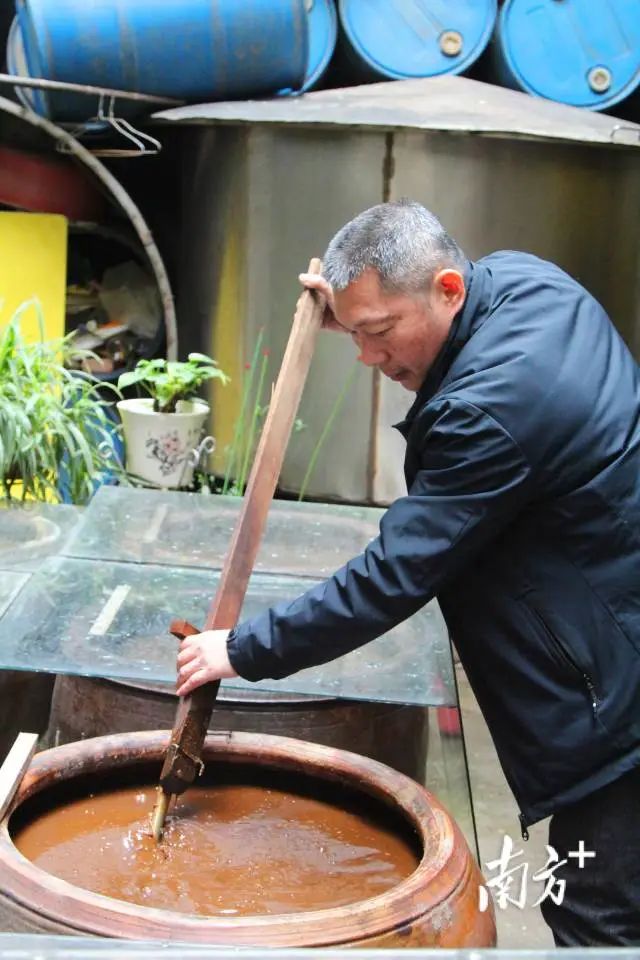 ▲揭陽市級代表性傳承人楊奕城攪拌發酵醬料。