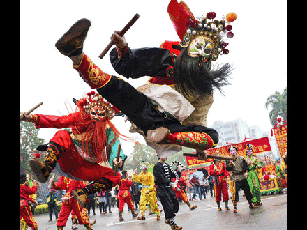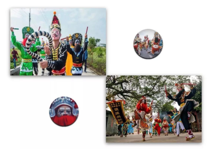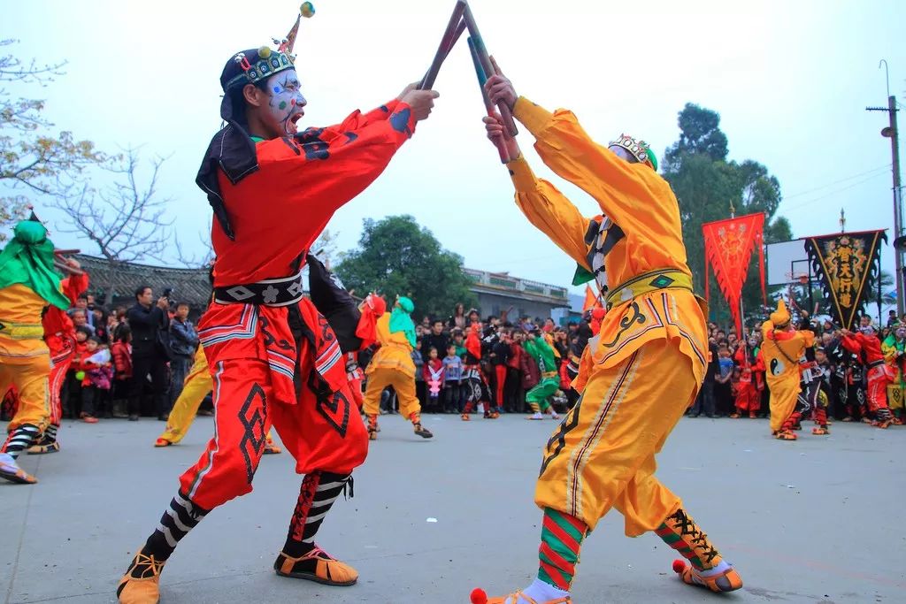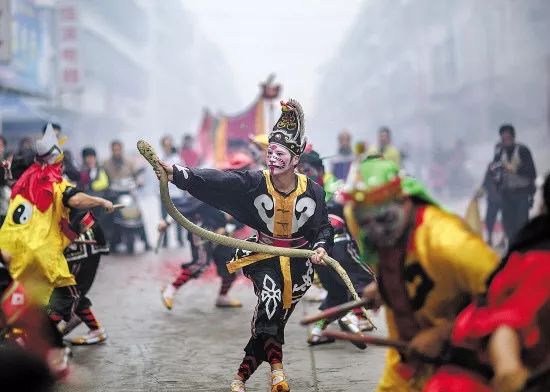 刻劃著獨特臉譜的舞者從古村街巷奔湧而出