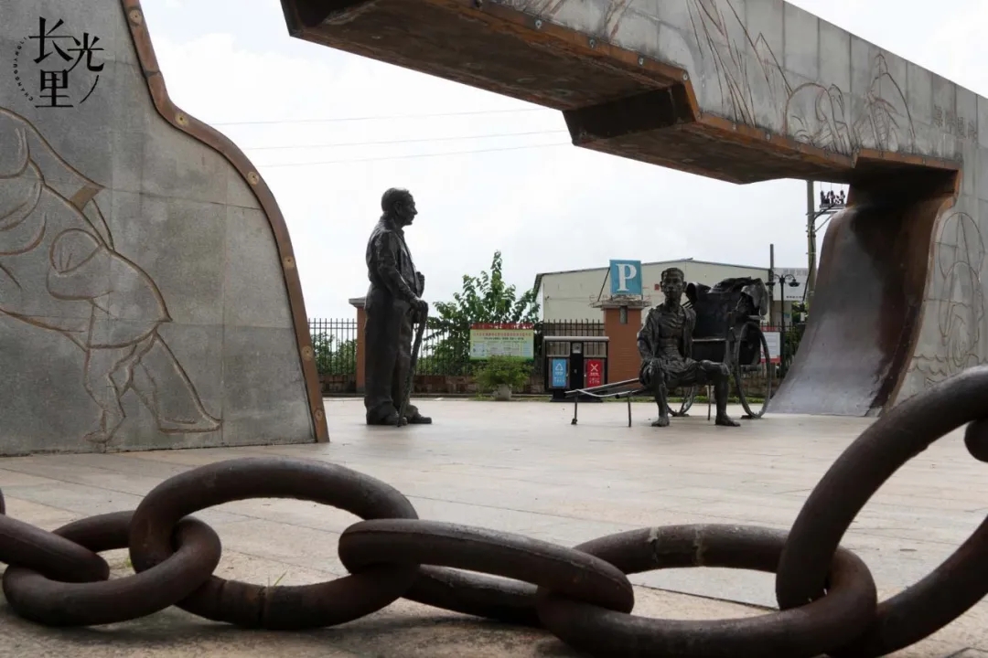 在陳慈黌故居前的廣場,透過沈重的鎖鏈,西裝革履的商賈、皮包骨的黃包車夫,這是潮商的形象變遷史。