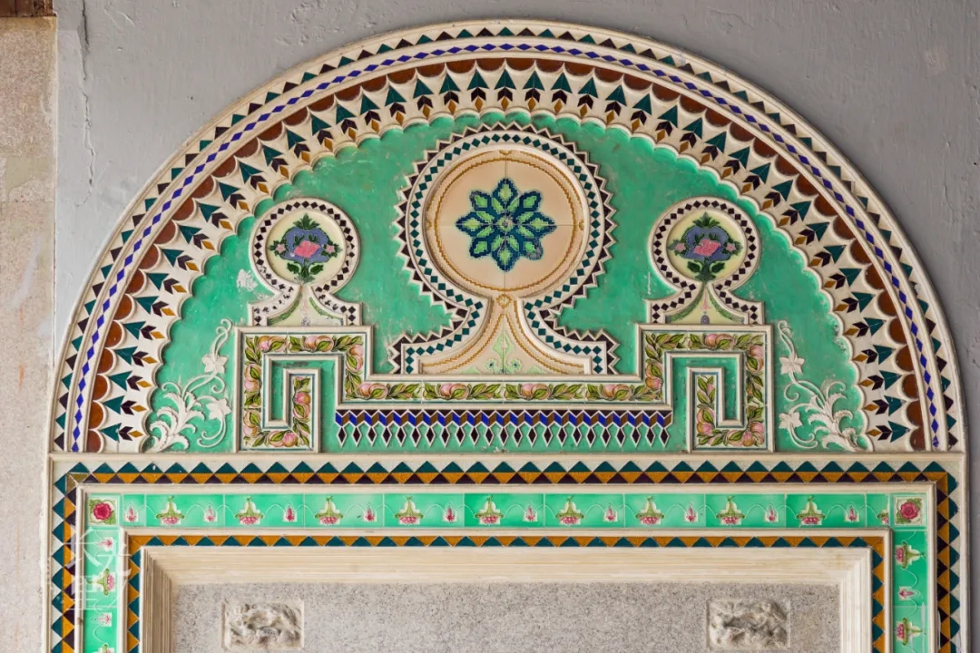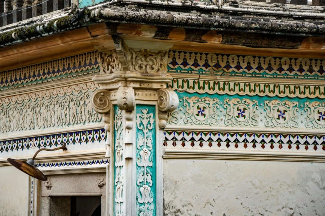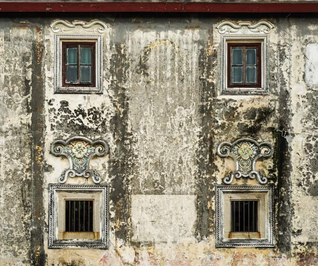 過道門和西式騎樓都貼滿了西洋瓷磚,展現了當時設計上的中西結合。其中不乏有“紅毛灰”(即現在的水泥)的大量堆砌和羅馬柱的應用。