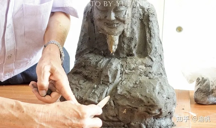 周師傅告訴我們,人物造像的形制較大,工藝要求也比較高,按傳統造像要求製作成型,裏面常常會用木材做模型架(現在多以鋼絲做成框架),以五彩加金或純貼金進行裝飾,具有色彩鮮艷明快,“神態逼真、富麗堂皇”的視覺效果。這類泥塑多見於道觀、庵寺、廟堂中,是捷勝泥塑工藝的藝術集中體現。