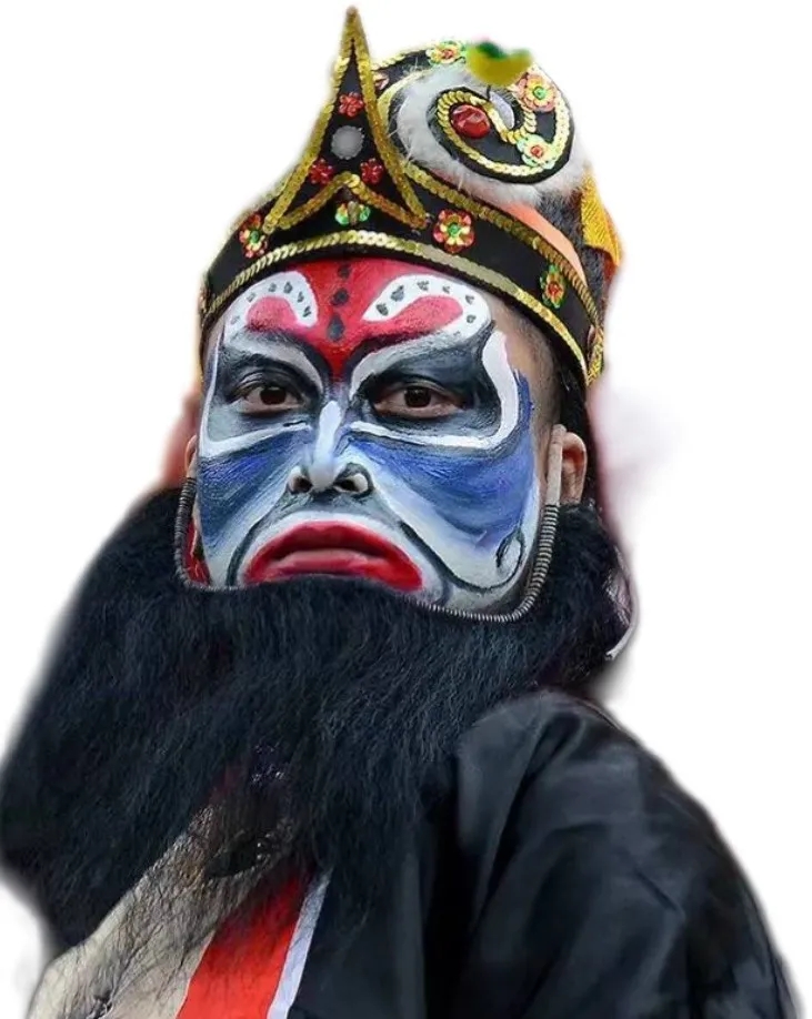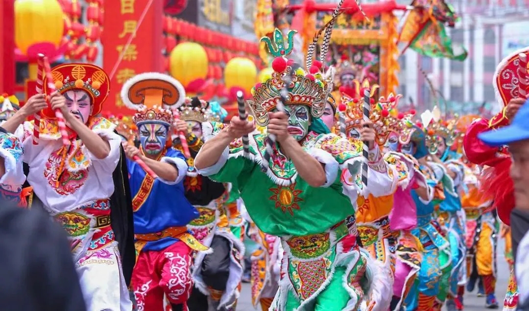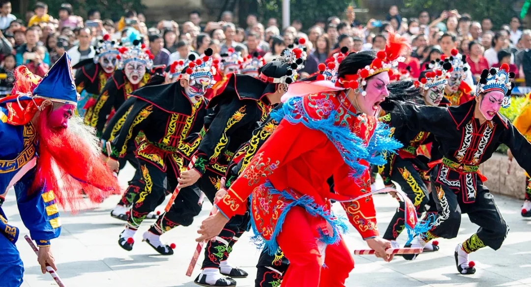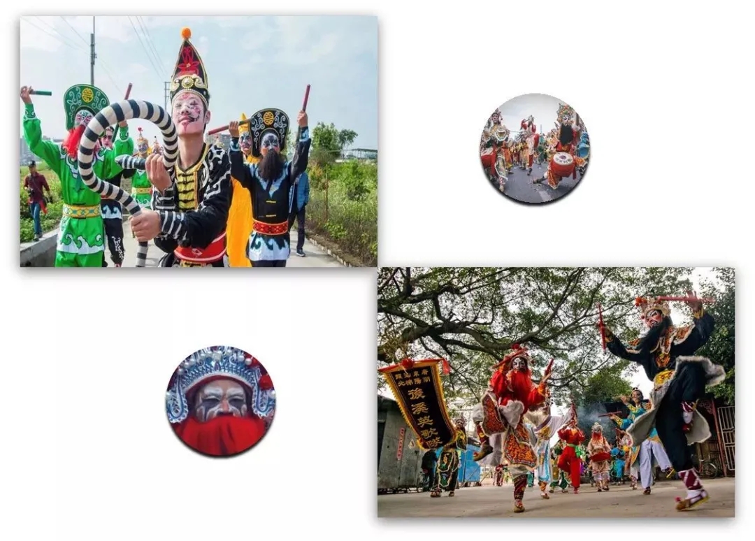 刻劃著獨特臉譜的舞者從古村街巷奔湧而出
