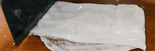粿條幾乎是純米漿製成,所以通身呈乳白色,前後兩面很是平整光滑。刷上防粘的食用油後,一張張粿皮摞在一起更像是一匹匹雪白的綢緞。