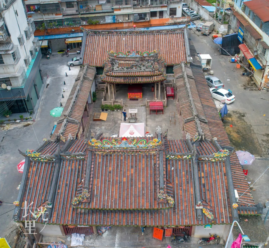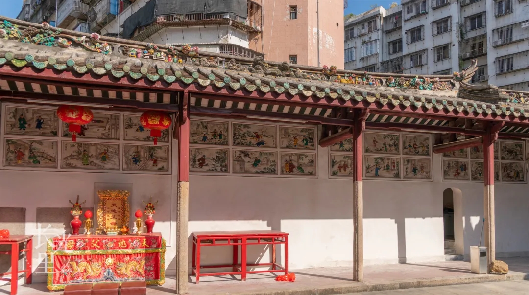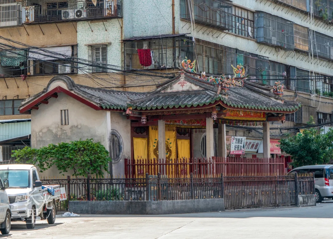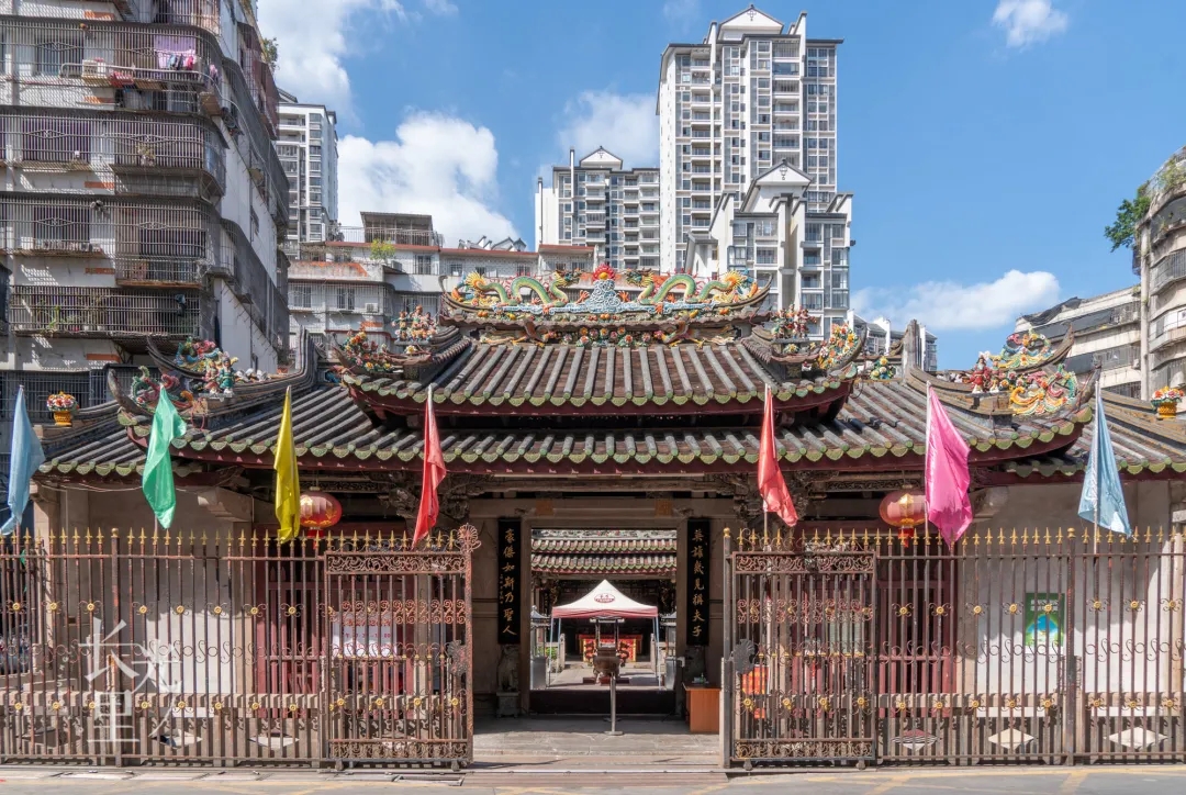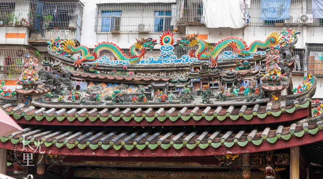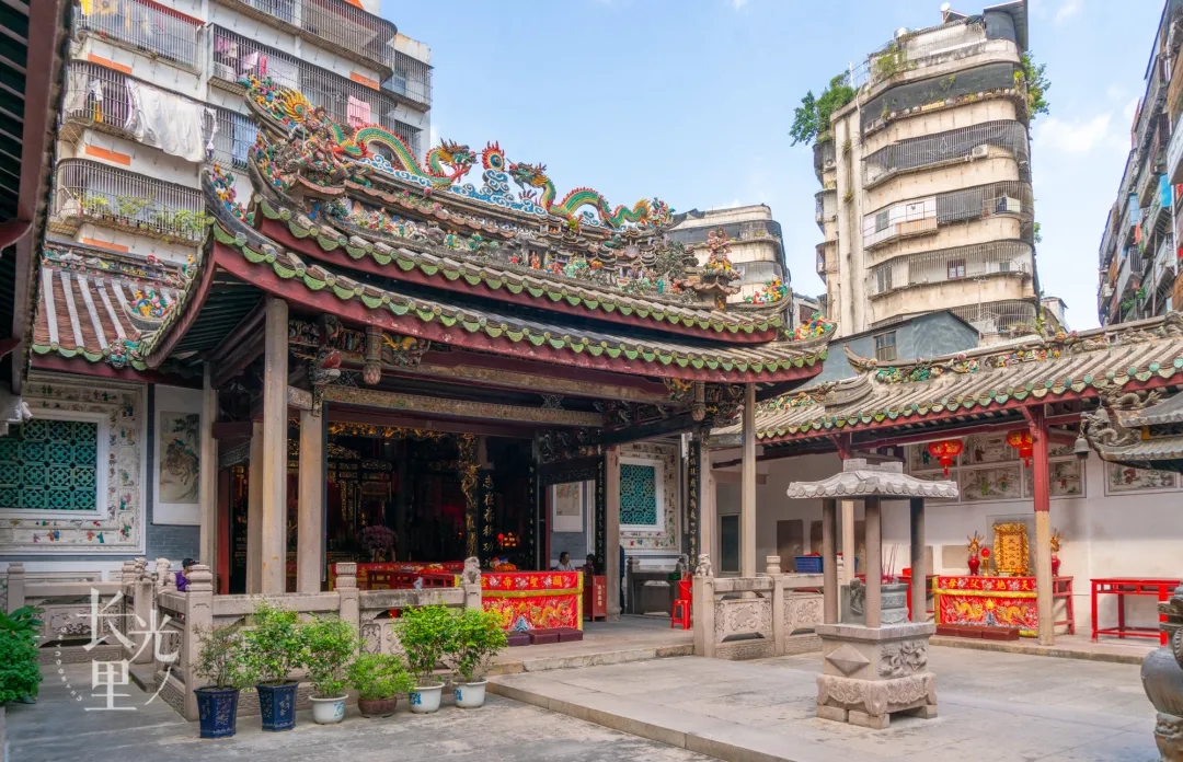 陽光下色彩艷麗的嵌瓷與廟宇周圍高密度的住宅樓,不銹鋼的防盜窗、新舊交錯的瓷磚外墻交錯出新舊的對碰。