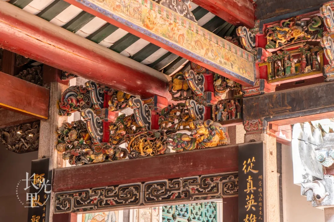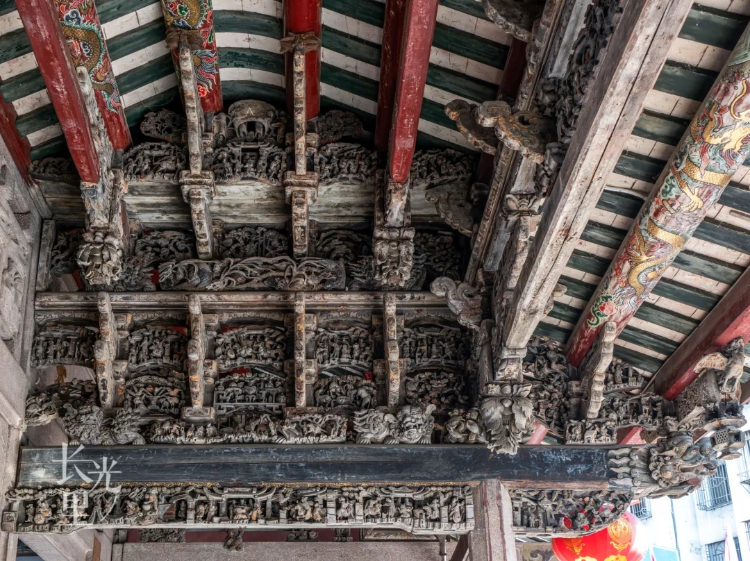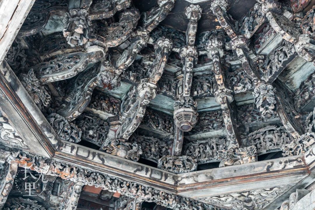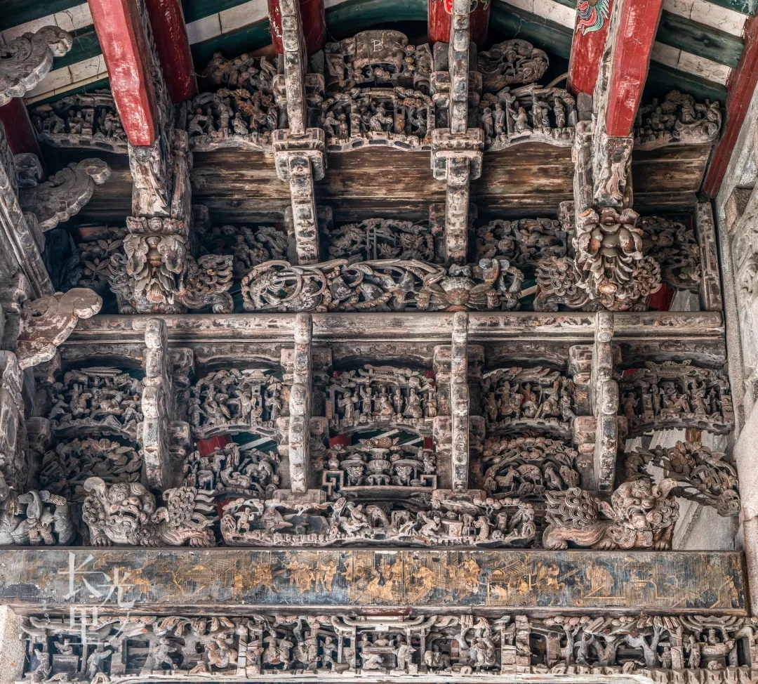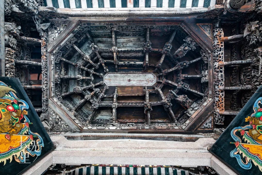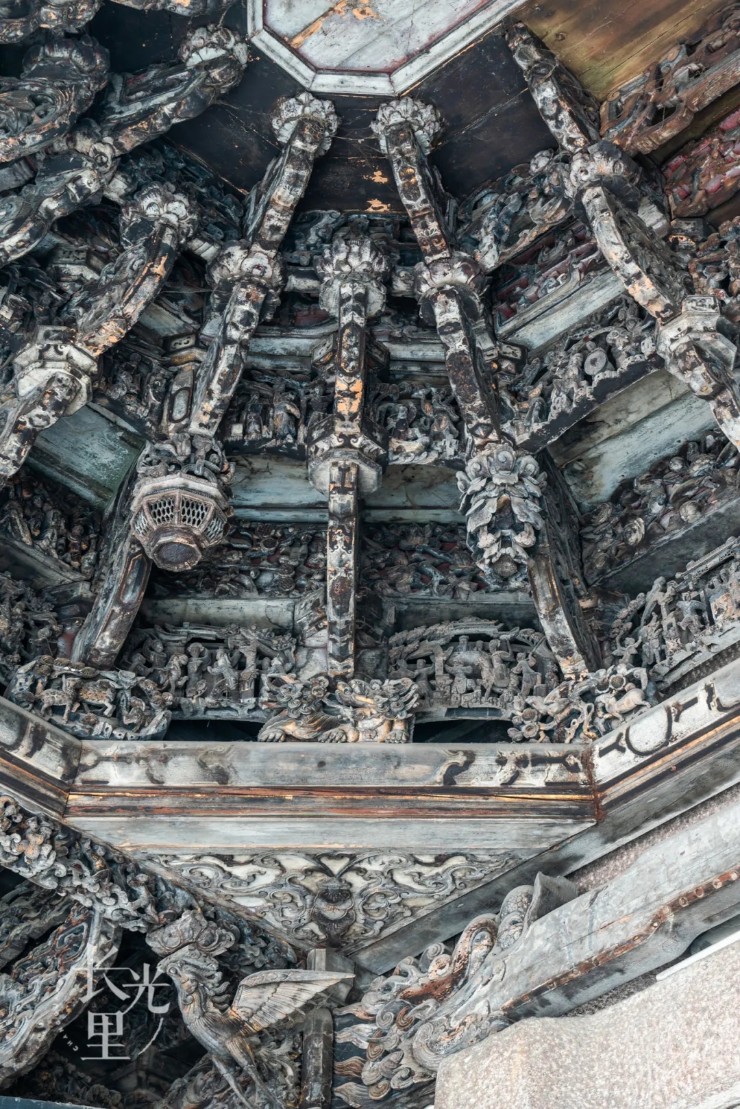 這個層層疊疊的八卦形藻井,是省內乃至國內罕見的潮汕古建築木雕藝術精品。它突破空間和時間的限制,通過鬼斧神工的雕刻技藝,疏朗的間構和驟然收縮的節奏,令你在一擡頭的瞬間,會心頭一驚,猶如靈魂被吸上穹頂。