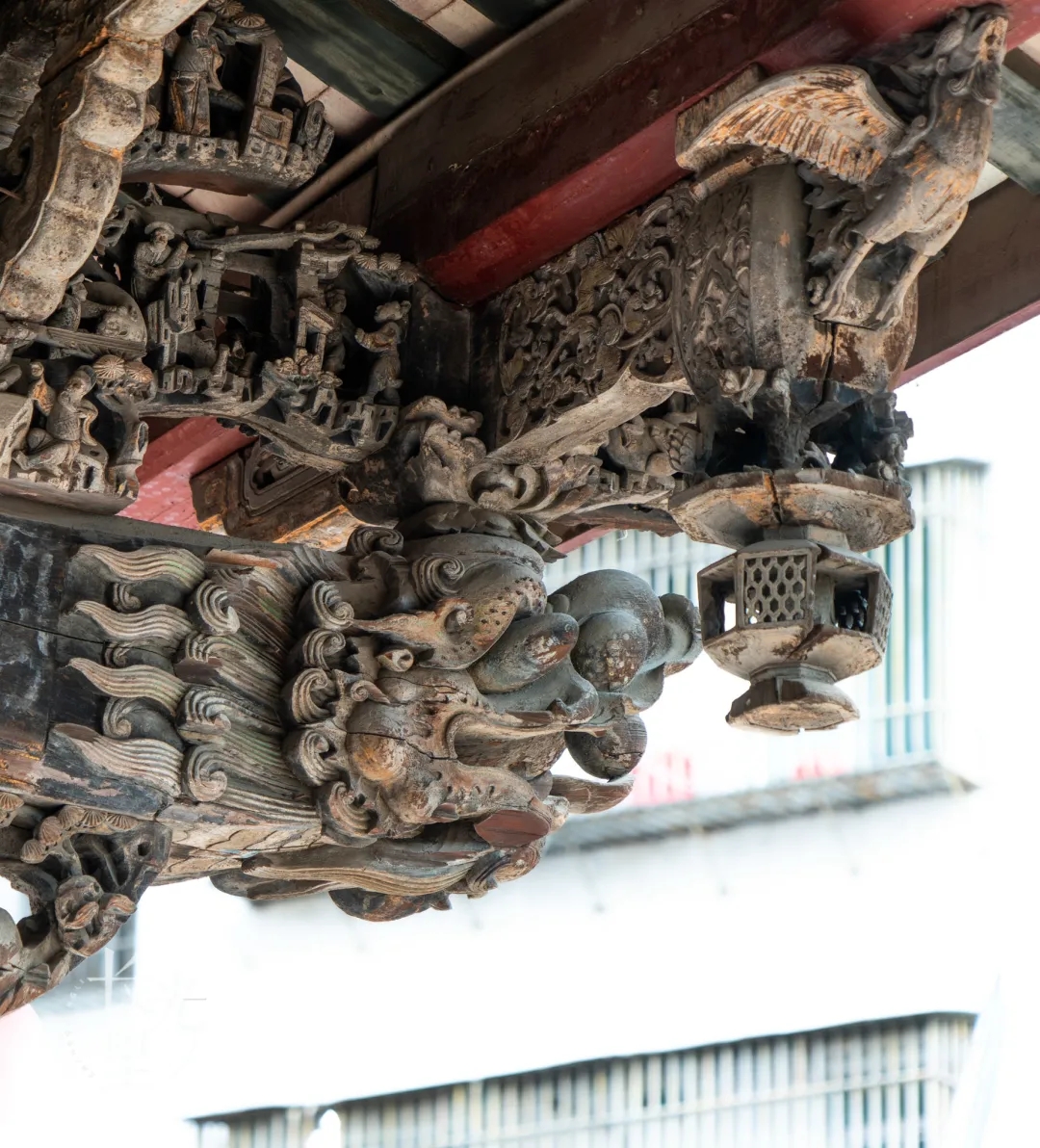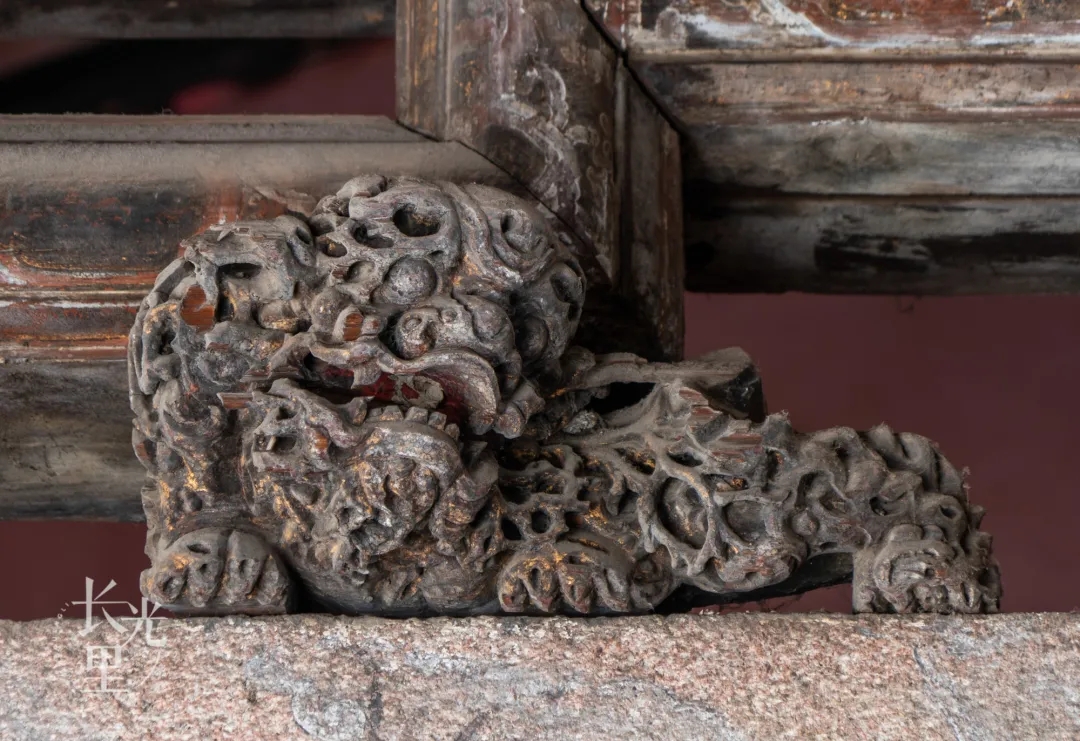 橫樑延伸出柱子的上端是龍屐頭,龍的神態和毛發細節的雕刻將其威嚴感顯得淋漓盡致。