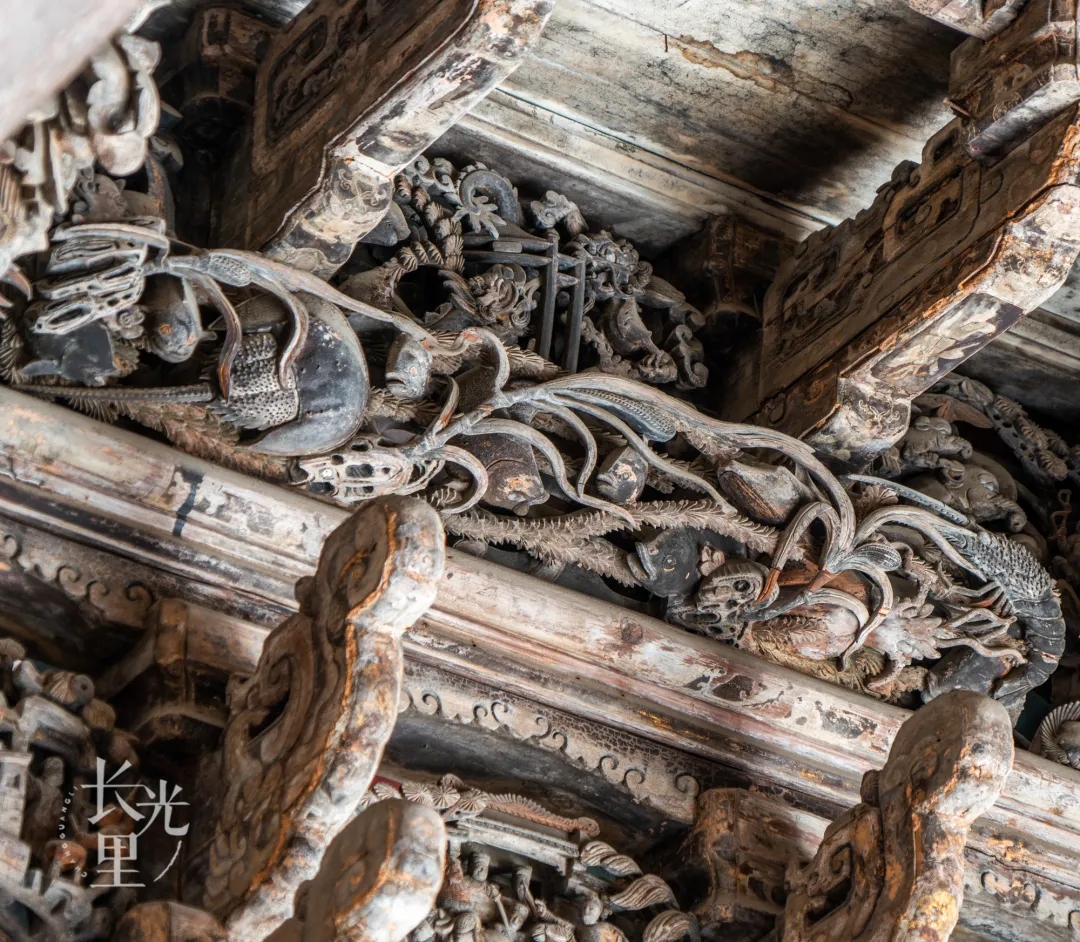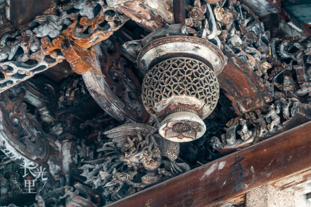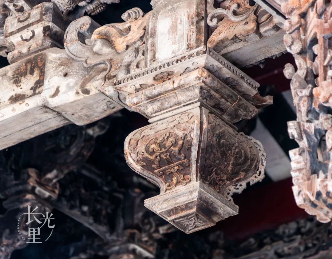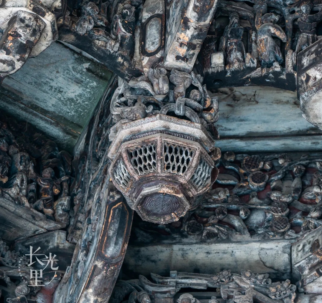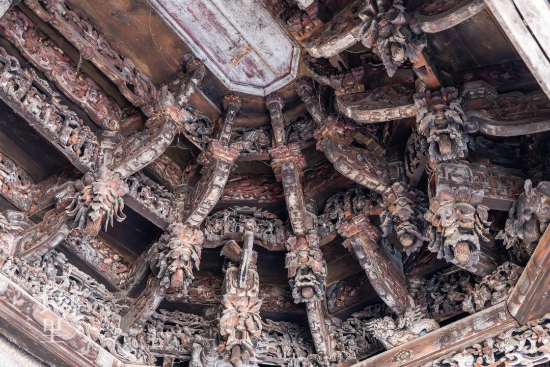 藻井上的木雕保存完好,表層的金漆雖已褪去,也未有過一絲一毫的添補,它依舊保留著古樸與滄桑,但視覺效果依然震撼。