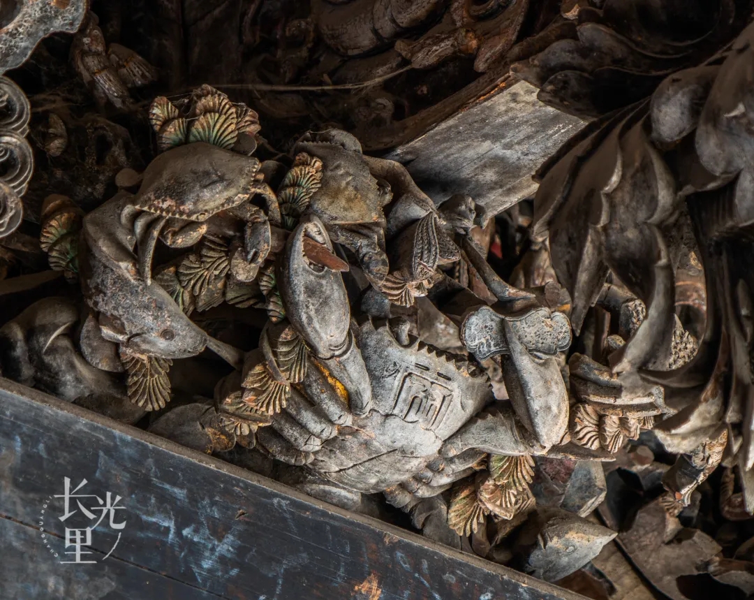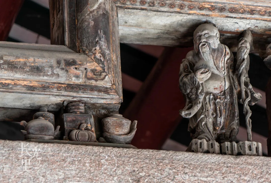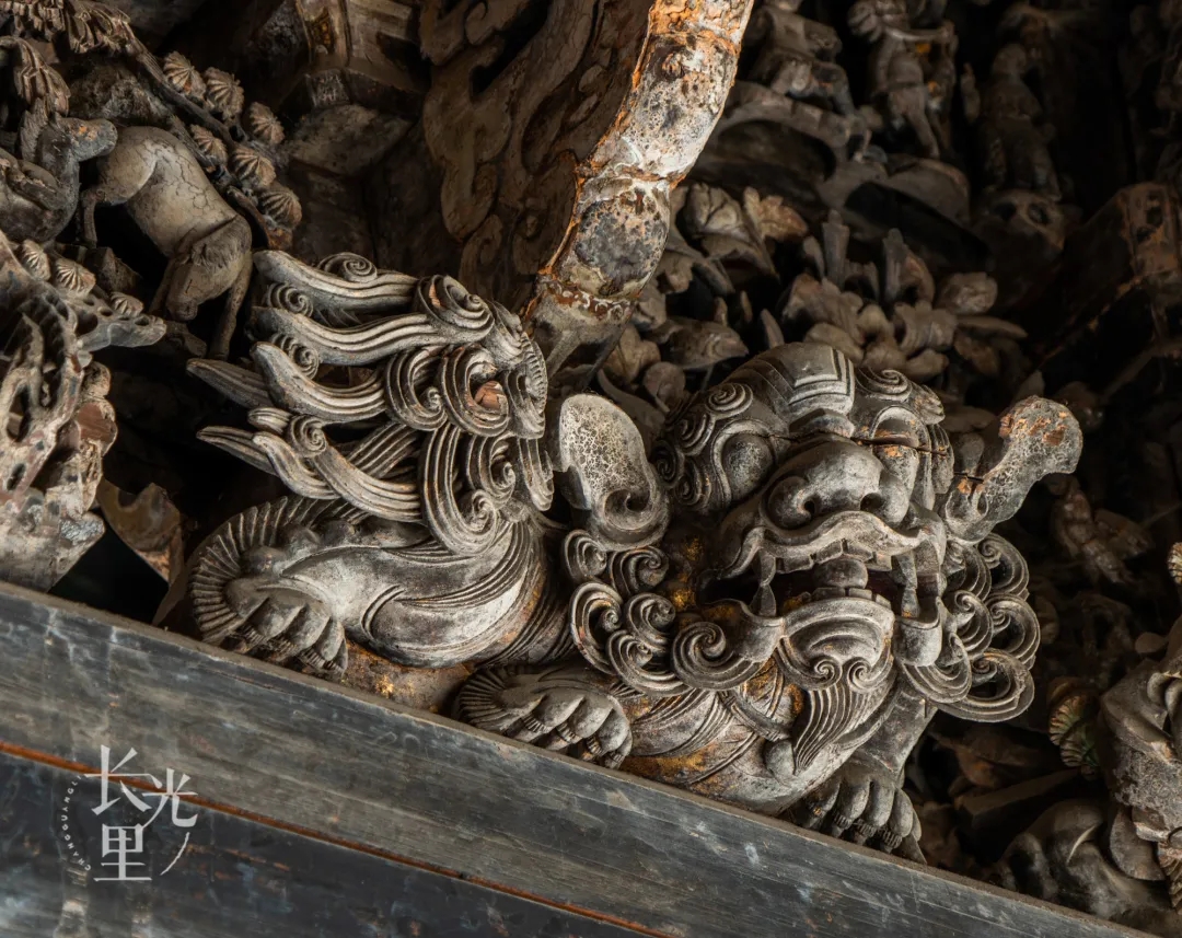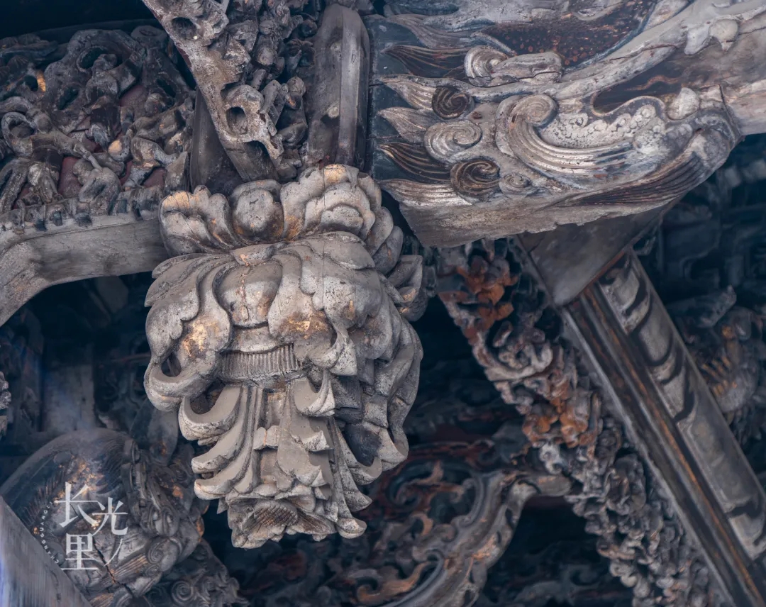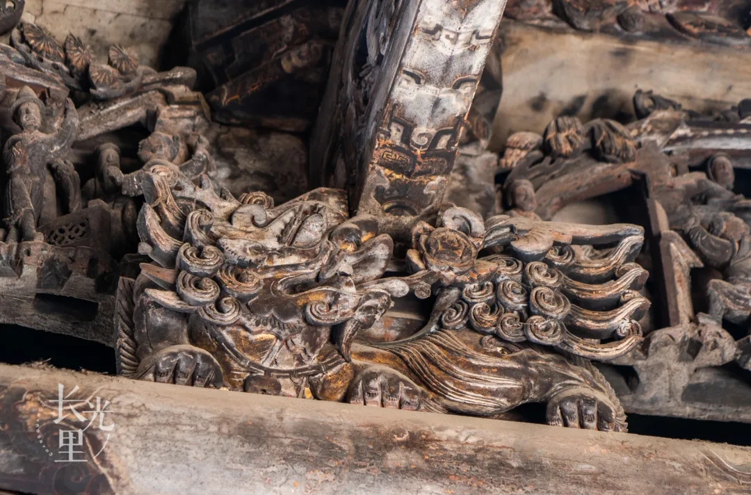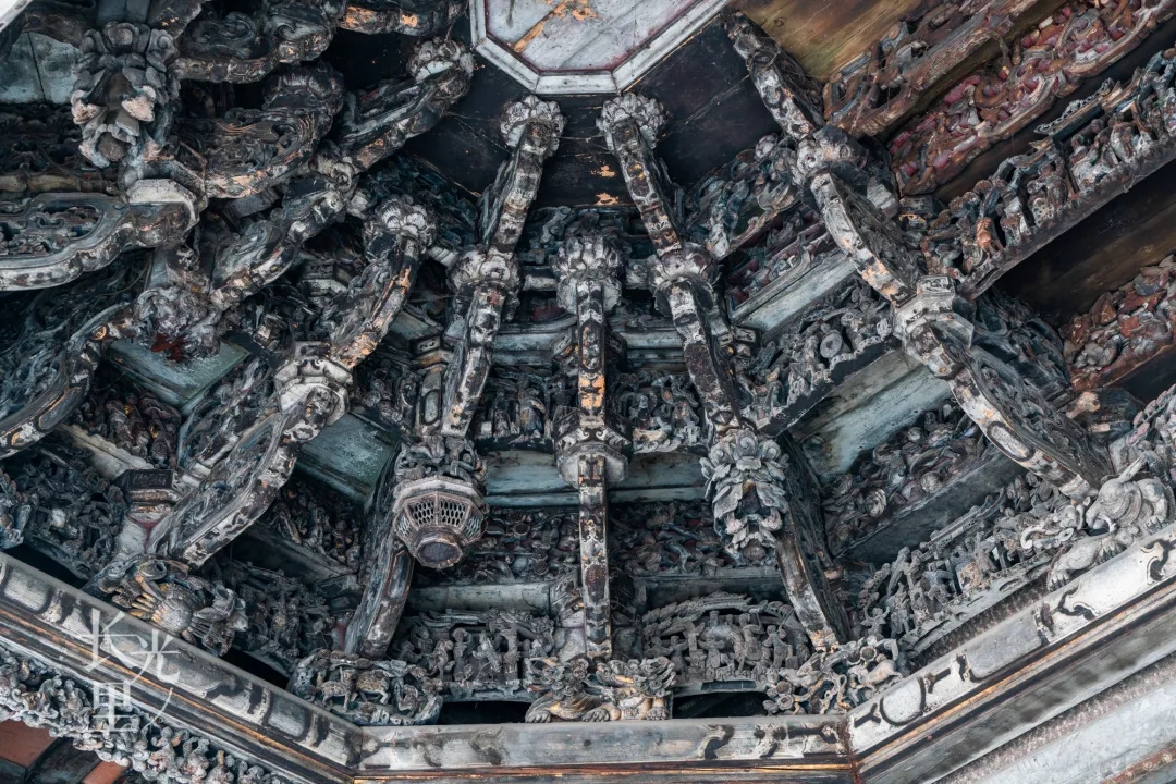藻井上的木雕保存完好,表層的金漆雖已褪去,也未有過一絲一毫的添補,它依舊保留著古樸與滄桑,但視覺效果依然震撼。
