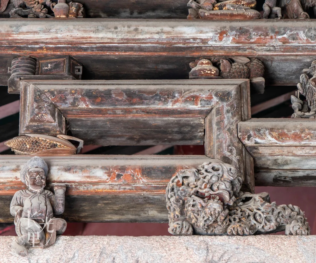 橫樑上的生動有趣的獅子,是自古以來我國認為的吉祥瑞物之一;高昂著獅頭、鼻大嘴闊、雙目圓瞪,頭和腳遍布捲毛,形象化的獅子依舊莊嚴雄偉。