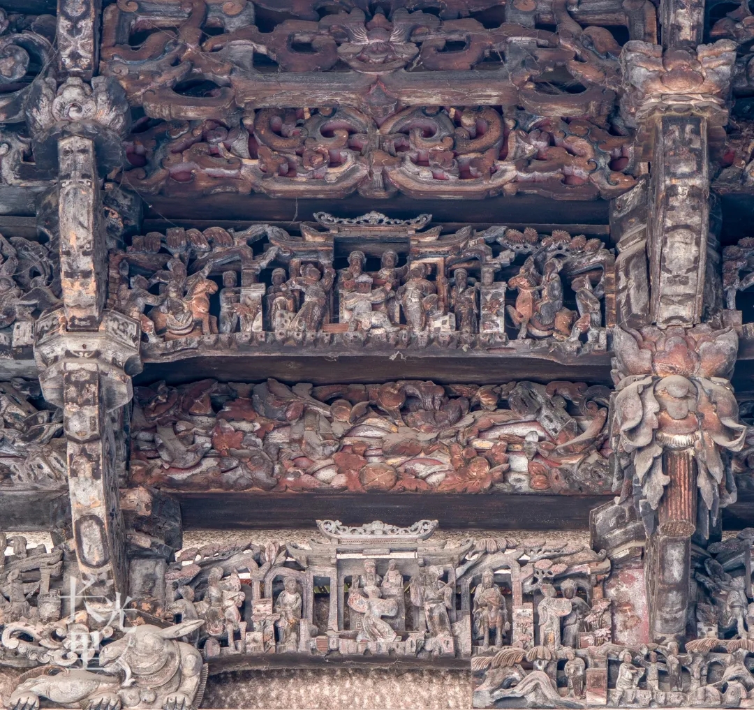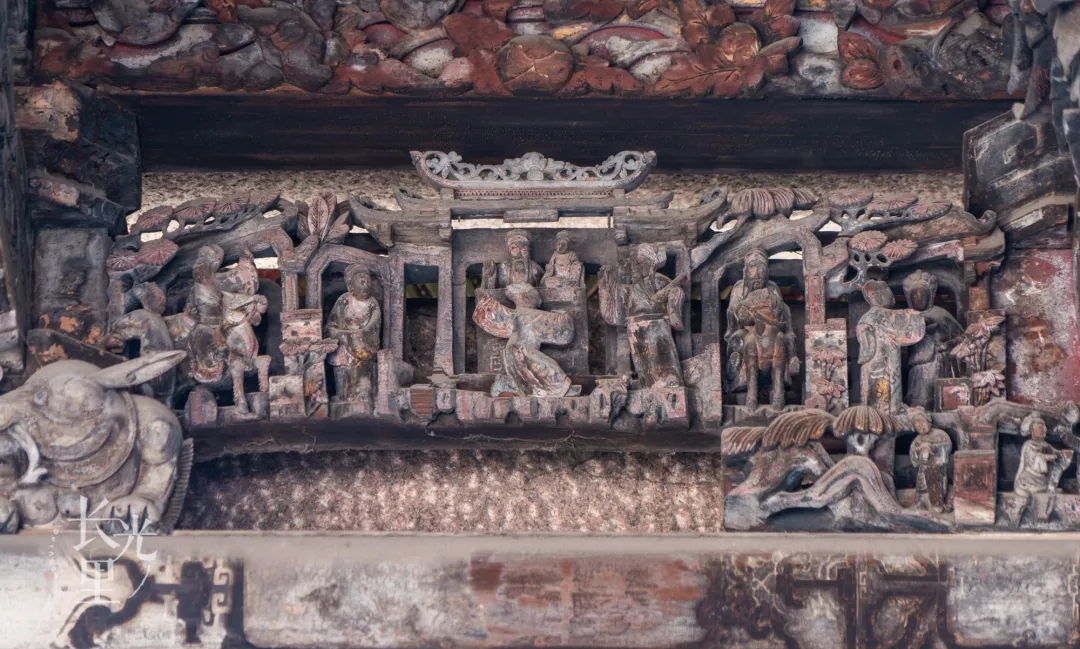 有限的房樑屋架空間裏,木雕人物或焦急、或歡喜、或威嚴、或沈思,生動的表情刻畫,人物的主次特徵位置,彷彿是我們在看斷了章的連環畫。