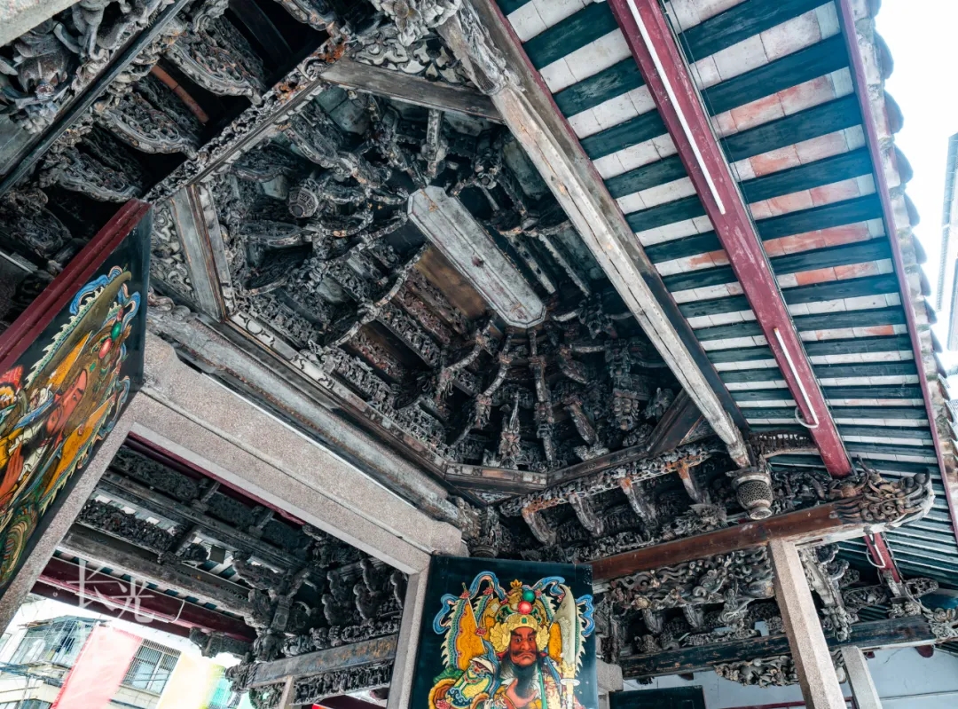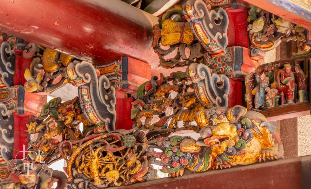 當阿伯在藻井下,期望能用眼睛能將那一筆一劃記在腦海中時,驟然發現:藻井並不對稱,且木雕呈現青、紅兩種色調,而這,是源於不同木雕藝人間的「對場」。