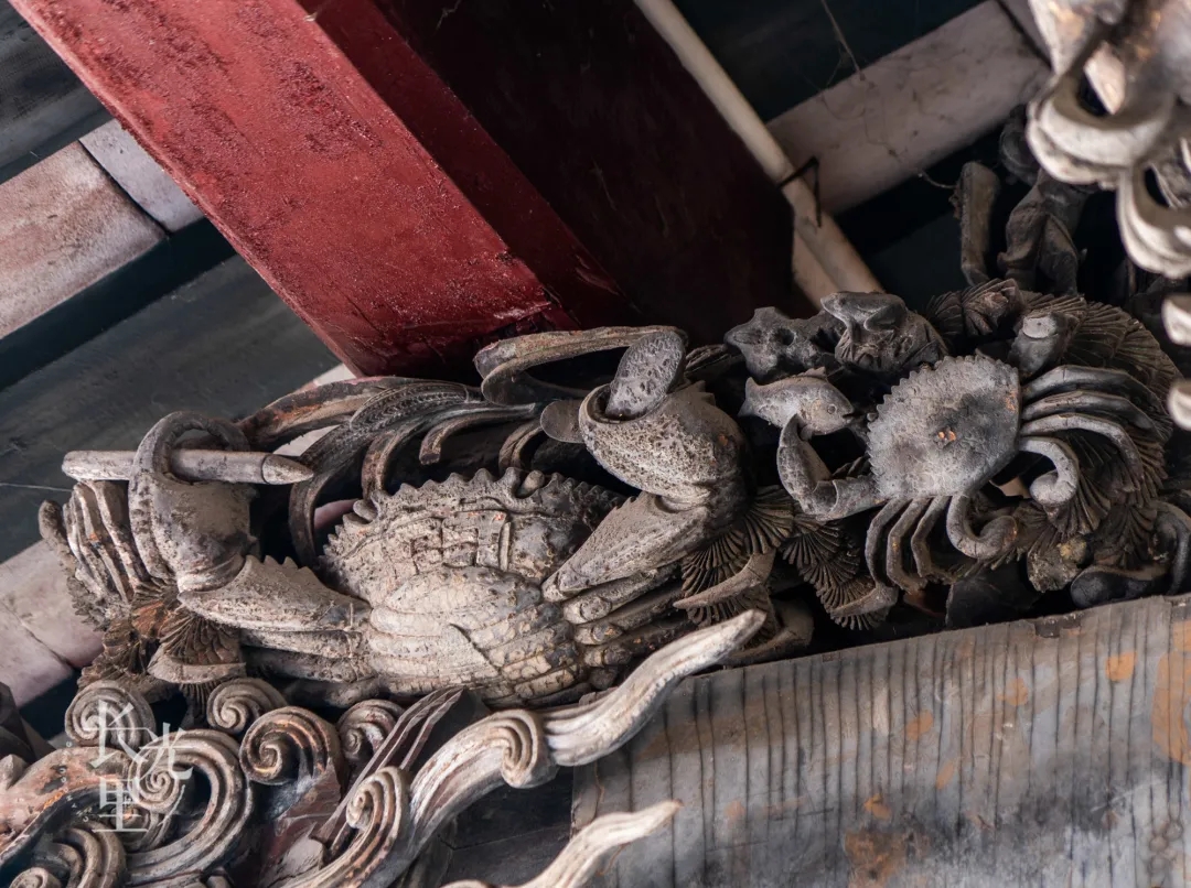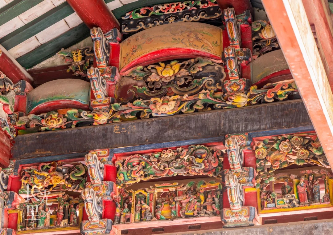 藻井上,有各種含吉祥寓意的傳統圖案;有反映當時海族與農耕生活的刻寫;有三國演義等各種神話故事的傳說。