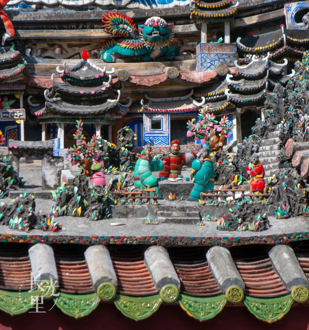 古榕武廟屋頂的嵌瓷除了二龍戲珠、天兵神將等傳統屋頂建築中屢見的題材外,以關羽為主角的三國演義故事,將亭臺樓閣、相關故事也被搬上主廟的屋頂。