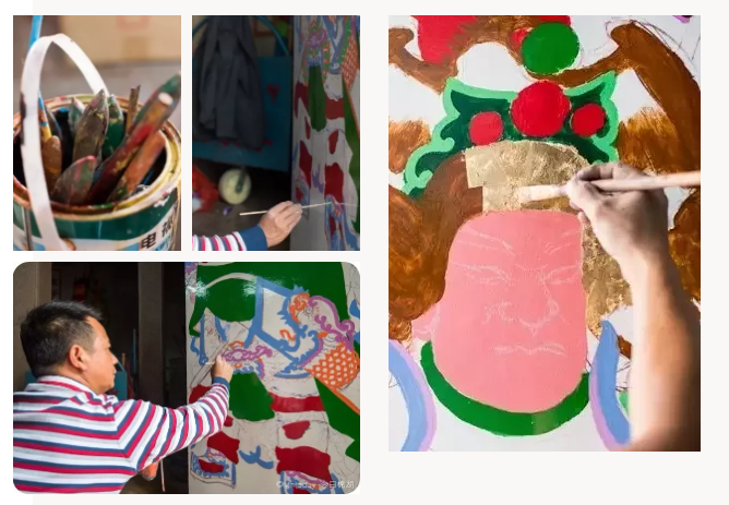 五彩金妝是在五彩繽紛的畫面中又添加一些亮度很高的金箔、銀箔,通過這個反差,來追求一種有光與無光、亮與不亮的裝飾意境,色彩也就變得更加鮮亮,表現力更為突出。正是這種色彩的獨特表現手法,造就了潮汕門神畫璀璨絢麗的畫面,達到雅俗共賞的藝術效果。