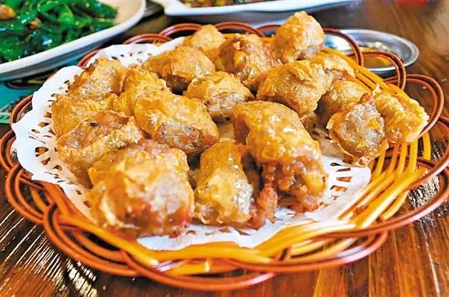 潮汕地區一道深受人們喜愛的美食——粿肉,雖然各個地方做法、餡料有所不同,但其中都少不了荸薺,粿肉的鮮甜離不開荸薺。做粿肉時,將荸薺沖洗乾淨後,削皮剁成一顆顆小粗粒,與其他餡料包括薯粉、豬肉丁、蔥白等,搭配油、鹽、胡椒粉等調味料混勻。接著,將一張圓形的腐膜剪成4小張扇形,取一小張,將餡料放在腐膜上卷成條狀。隨後,放鍋裏蒸熟。吃的時候,把粿肉切成小節,放入油中炸至金黃,撈起置於盤中,蘸以金桔油。慢慢品嚐,腐膜的酥脆、肉味的鮮香、荸薺的爽口,真是一道讓人念念不忘的人間美味啊。