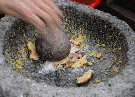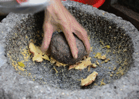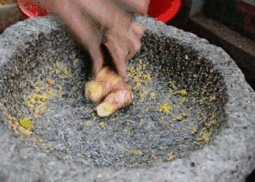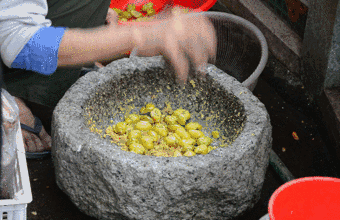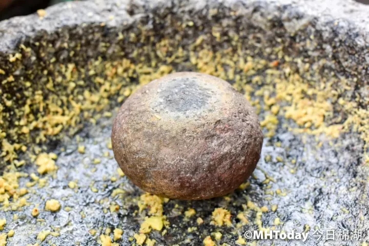 據鄭伯介紹,每天早上他都要先去採摘新鮮橄欖,然後下午便開始製作橄欖糝。橄欖糝的製作過程十分簡單,但製作的工序卻十分費力氣。首先先把南薑洗淨後,放在石臼中研磨成南薑末,接著撒上一些鹽,然後把洗好的橄欖放入裝著南薑末和鹽的石臼中進行捶打,使橄欖滲入南薑味。