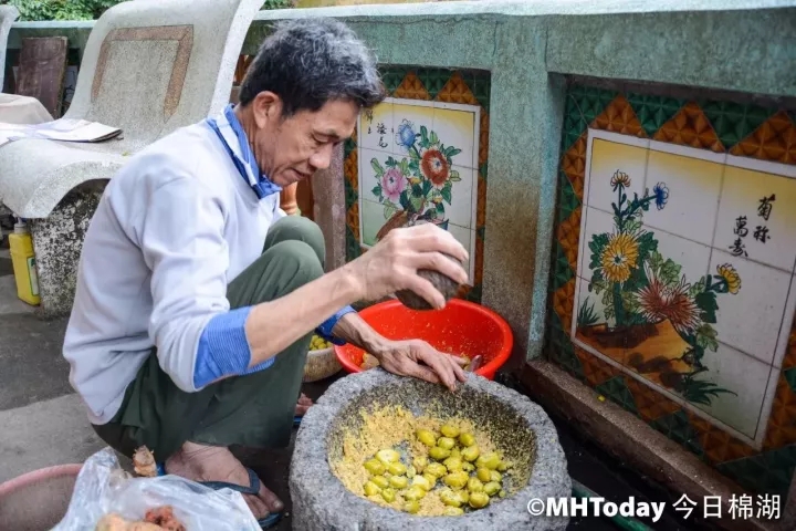 走過九曲橋,迎面便看到一間小小的舖子,舖子的主人鄭伯正在製作橄欖糝。只見他拿著石頭捶打放在石臼中的橄欖,周圍散發著橄欖的清香,而黃色的南姜則給橄欖增添了不一樣的美味。