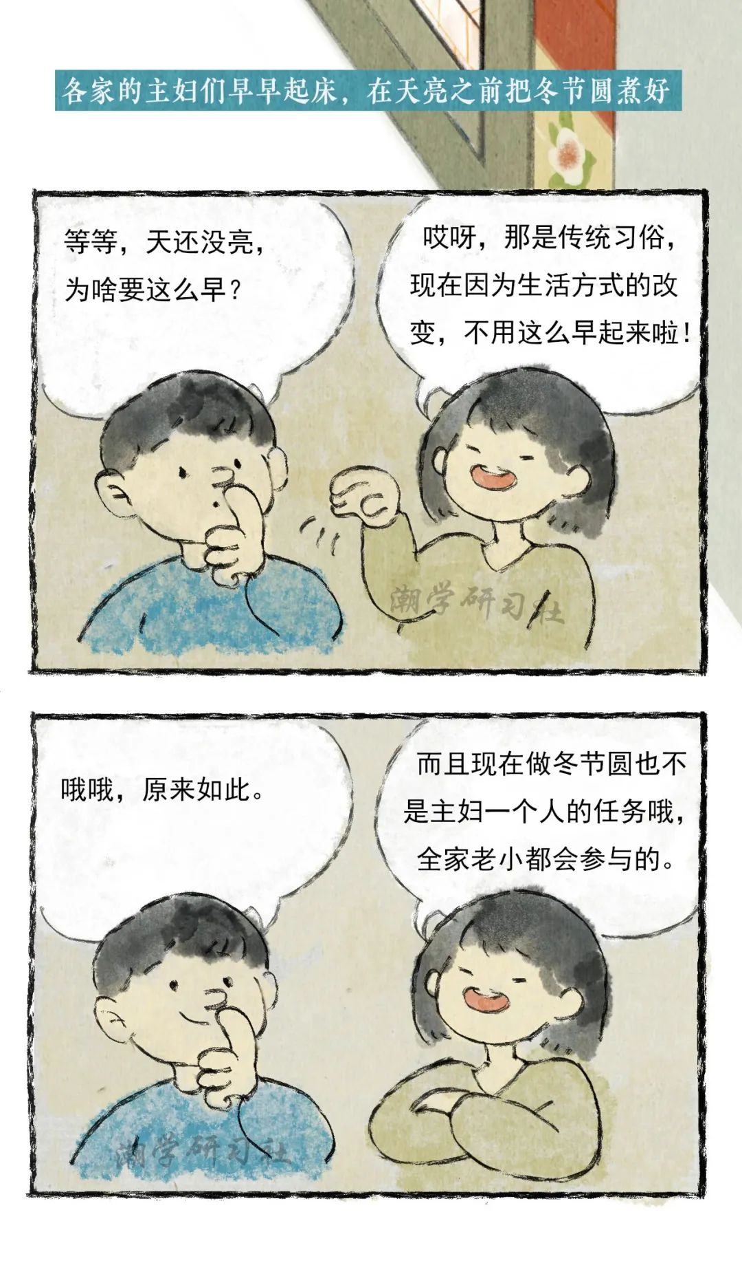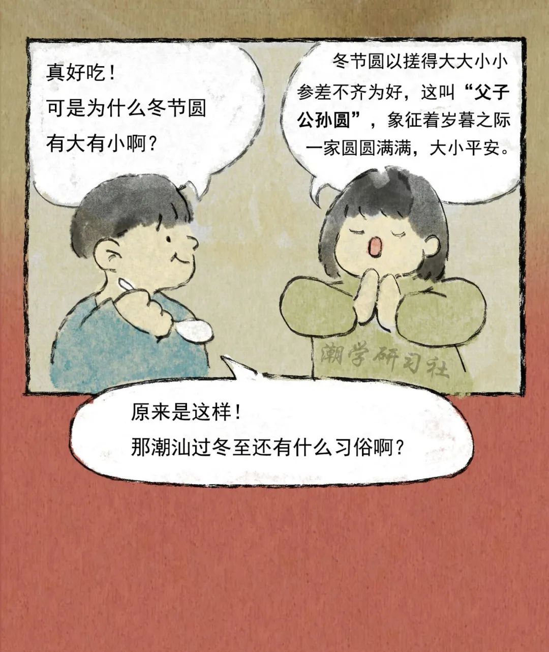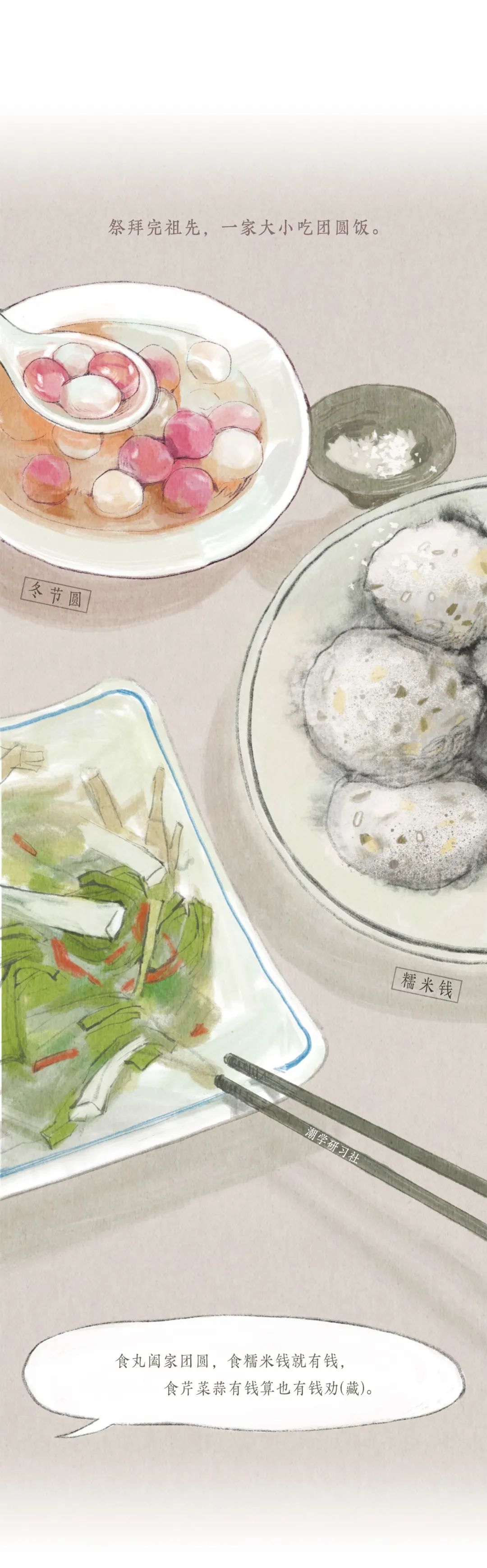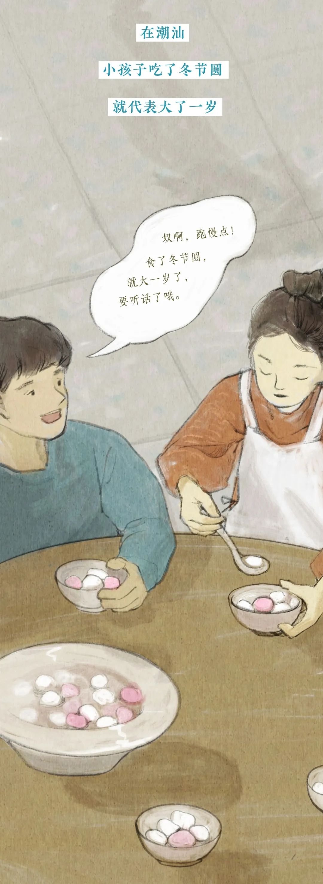 我對於冬至最大的印象呢,應該是冬至前一天的晚上,因為在那一天晚上媽媽會提前準備好做湯圓的材料,然後把我喊過來,教我怎麽「挲圓」。小小的我總會把「圓」梭得大小不一,在一旁一邊看潮劇一邊看我們「挲圓「的爺爺總會說「這是爺孫圓」,冬至、挲圓與潮劇共同構成了我對冬至的美好回憶。