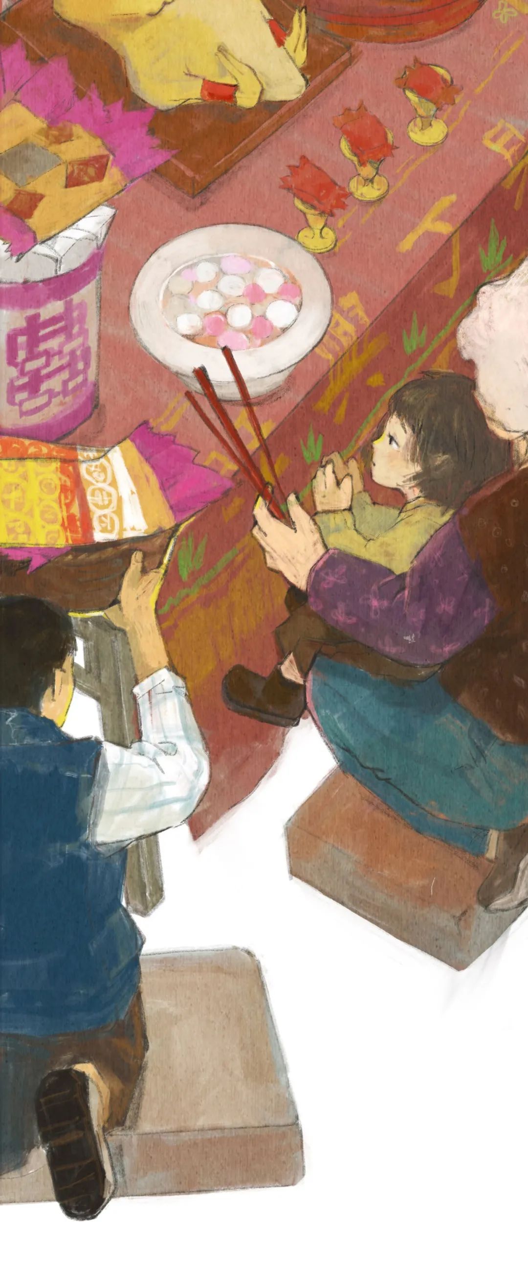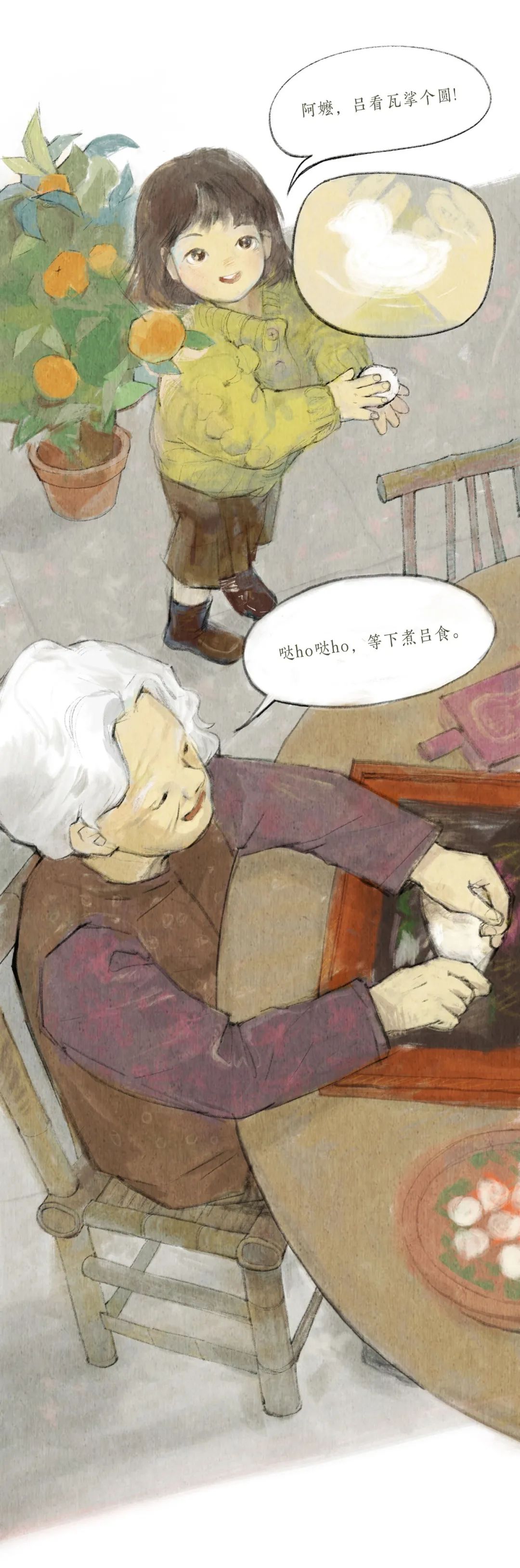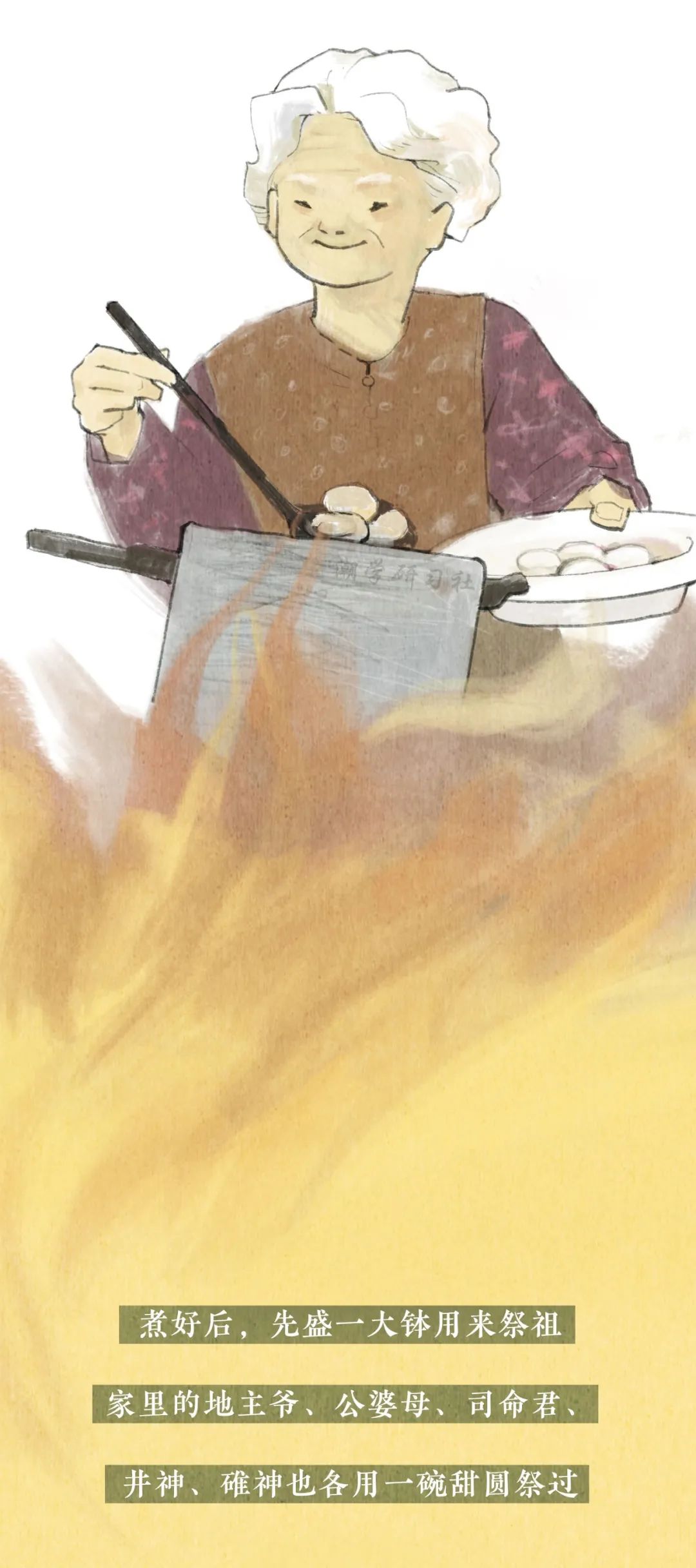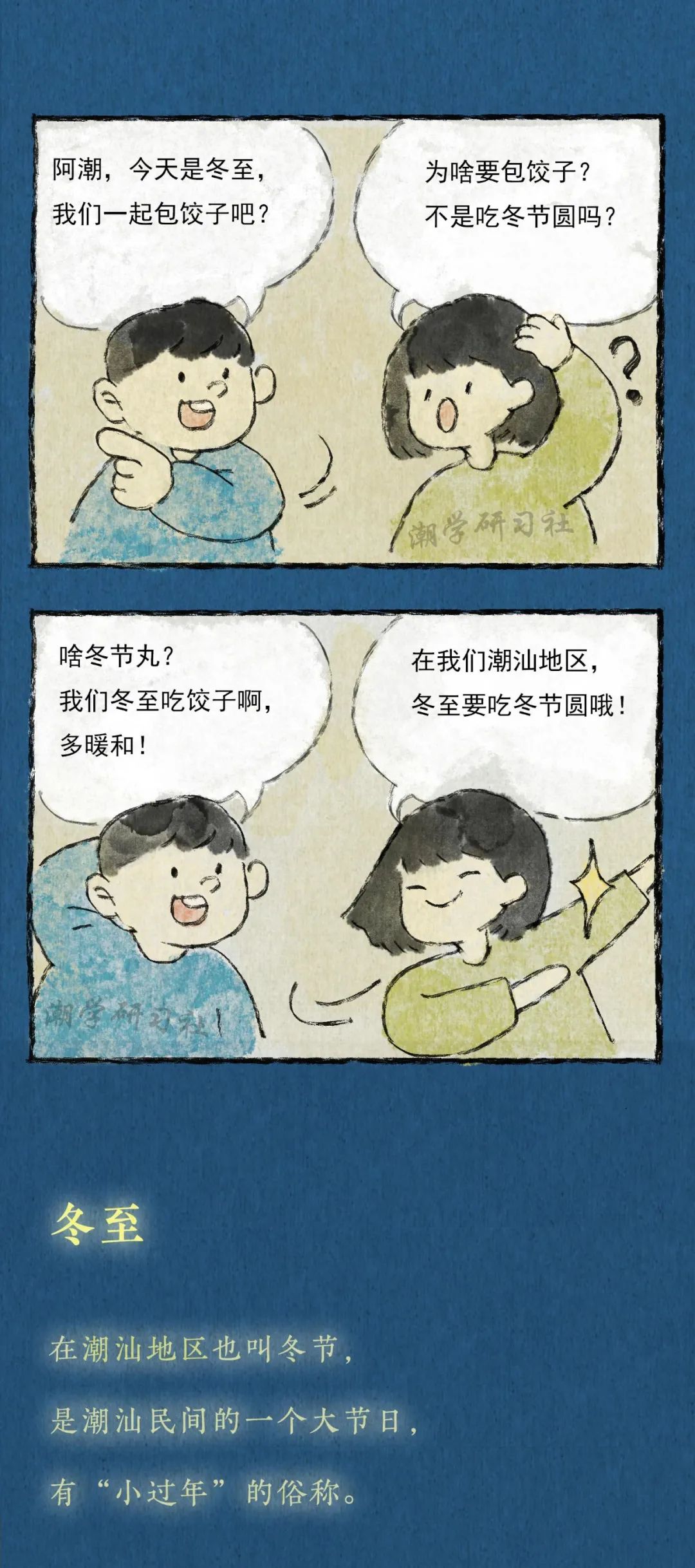 我對於冬至最大的印象呢,應該是冬至前一天的晚上,因為在那一天晚上媽媽會提前準備好做湯圓的材料,然後把我喊過來,教我怎麽「挲圓」。小小的我總會把「圓」梭得大小不一,在一旁一邊看潮劇一邊看我們「挲圓「的爺爺總會說「這是爺孫圓」,冬至、挲圓與潮劇共同構成了我對冬至的美好回憶。