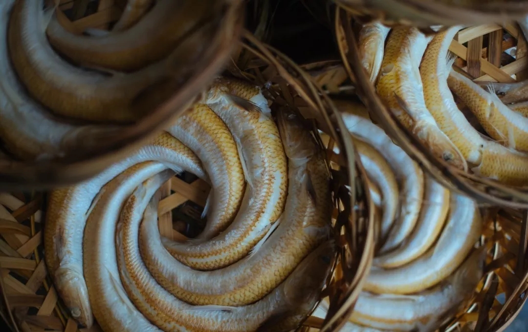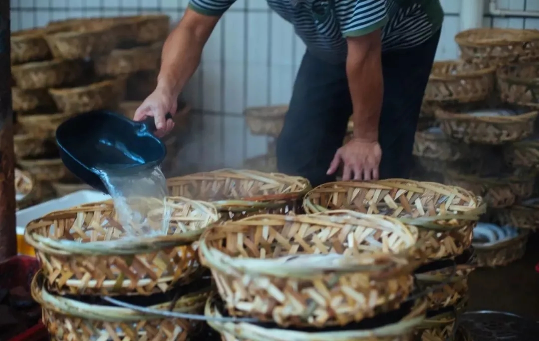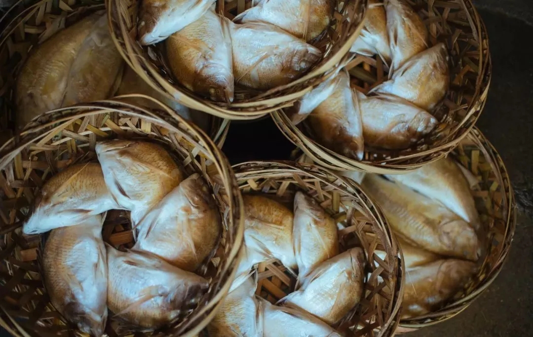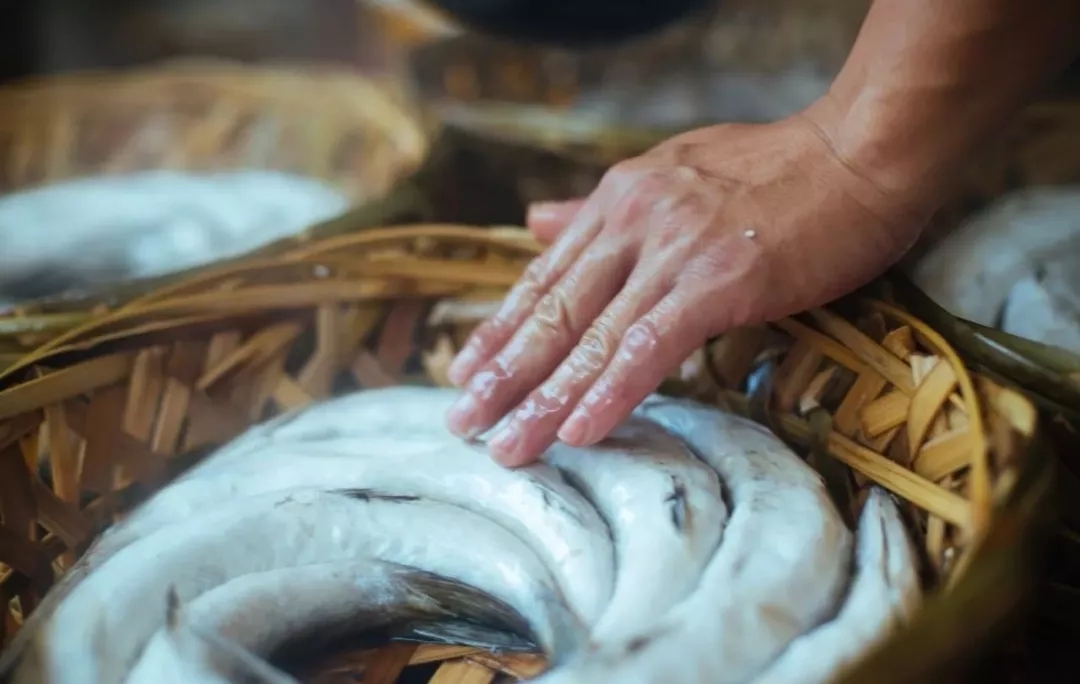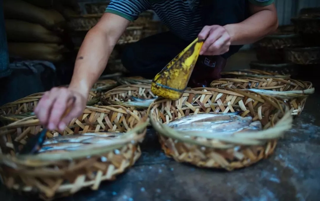 製作魚飯,講究猛火深湯,用吊鉤把摞好的筐筐放進湯鍋裏,掌握好火候,煮個片刻就要取出來。剛煮好的魚飯需要晾一會,然後用沸騰的鹽水澆在魚上,打理乾脆,晾涼,就能吃了。